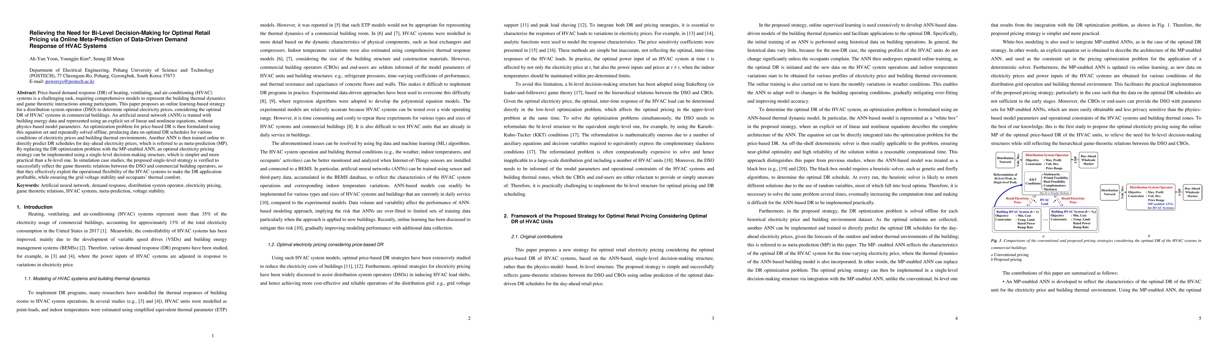Price-based demand response (DR) of heating, ventilating, and air-conditioning (HVAC) systems is a challenging task, requiring comprehensive models to represent the building thermal dynamics and game theoretic interactions among participants. This paper proposes an online learning-based strategy for a distribution system operator (DSO) to determine optimal electricity prices, considering the optimal DR of HVAC systems in commercial buildings. An artificial neural network (ANN) is trained with building energy data and represented using an explicit set of linear and nonlinear equations, without physics-based model parameters. An optimization problem for price-based DR is then formulated using this equation set and repeatedly solved offline, producing data on optimal DR schedules for various conditions of electricity prices and building thermal environments. Another ANN is then trained online to directly predict DR schedules for day-ahead electricity prices, which is referred to as meta-prediction (MP). By replacing the DR optimization problem with the MP-enabled ANN, an optimal electricity pricing strategy can be implemented using a single-level decision-making structure, which is simpler and more practical than a bi-level one. In simulation case studies, the proposed single-level strategy is verified to successfully reflect the game theoretic relations between the DSO and commercial building operators, so that they effectively exploit the operational flexibility of the HVAC systems to make the DR application profitable, while ensuring the grid voltage stability and occupants thermal comfort.