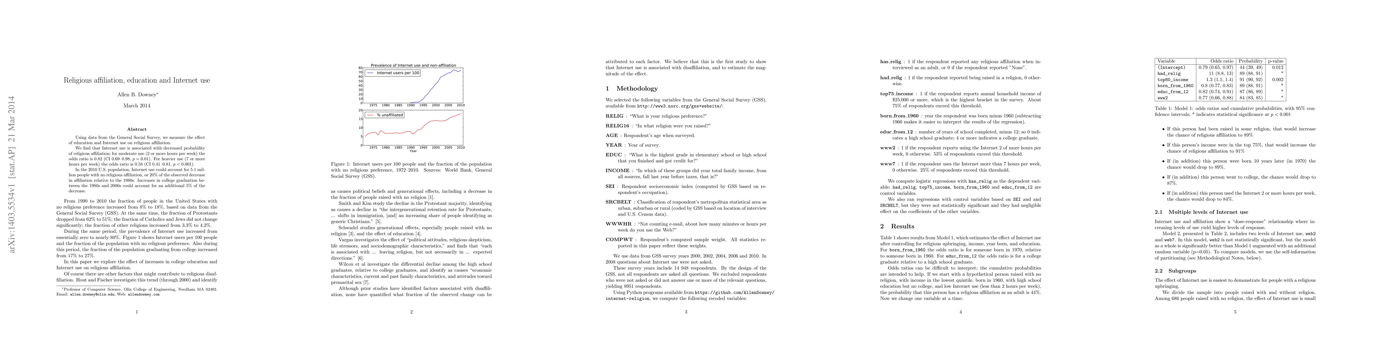 This study finds that Internet use correlates with a decreased likelihood of religious affiliation, with heavier use showing a stronger effect. The research suggests that Internet use could account for 20% of the decline in religious affiliation in the U.S. since the 1980s, with increased education also contributing to this trend.