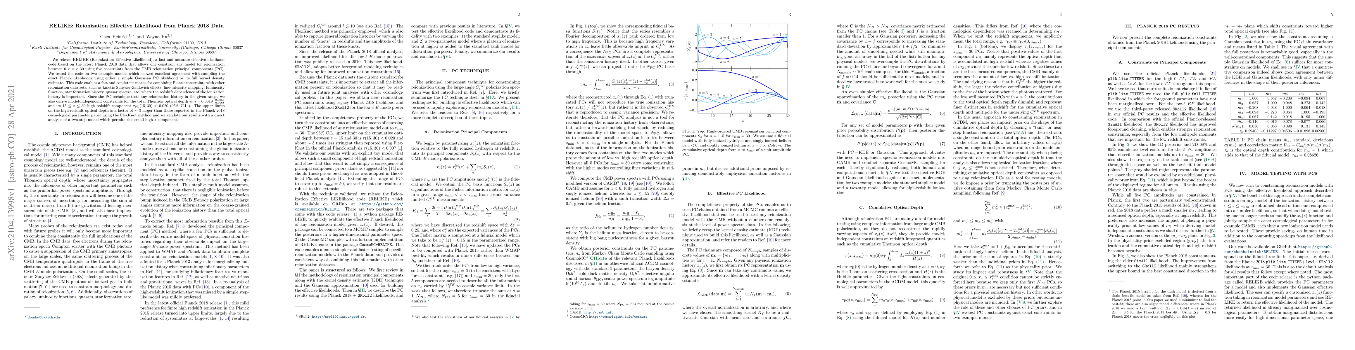 We release RELIKE (Reionization Effective Likelihood), a fast and accurate effective likelihood code based on the latest Planck 2018 data that allows one constrain any model for reionization between $6 < z < 30$ using five constraints from the CMB reionization principal components (PC). We tested the code on two example models which showed excellent agreement with sampling the exact Planck likelihoods using either a simple Gaussian PC likelihood or its full kernel density estimate. This code enables a fast and consistent means for combining Planck constraints with other reionization data sets, such as kinetic Sunyaev-Zeldovich effects, line-intensity mapping, luminosity function, star formation history, quasar spectra, etc, where the redshift dependence of the ionization history is important. Since the PC technique tests any reionization history in the given range, we also derive model-independent constraints for the total Thomson optical depth $\tau_{\rm PC} = 0.0619^{+0.0056}_{-0.0068}$ and its $15\le z \le 30$ high redshift component $\tau_{\rm PC}(15, 30) < 0.020 $ (95\% C.L.). The upper limits on the high-redshift optical depth is a factor of $\sim3$ larger than those reported in the Planck 2018 cosmological parameter paper using the FlexKnot method and we validate our results with a direct analysis of a two-step model which permits this small high-$z$ component.