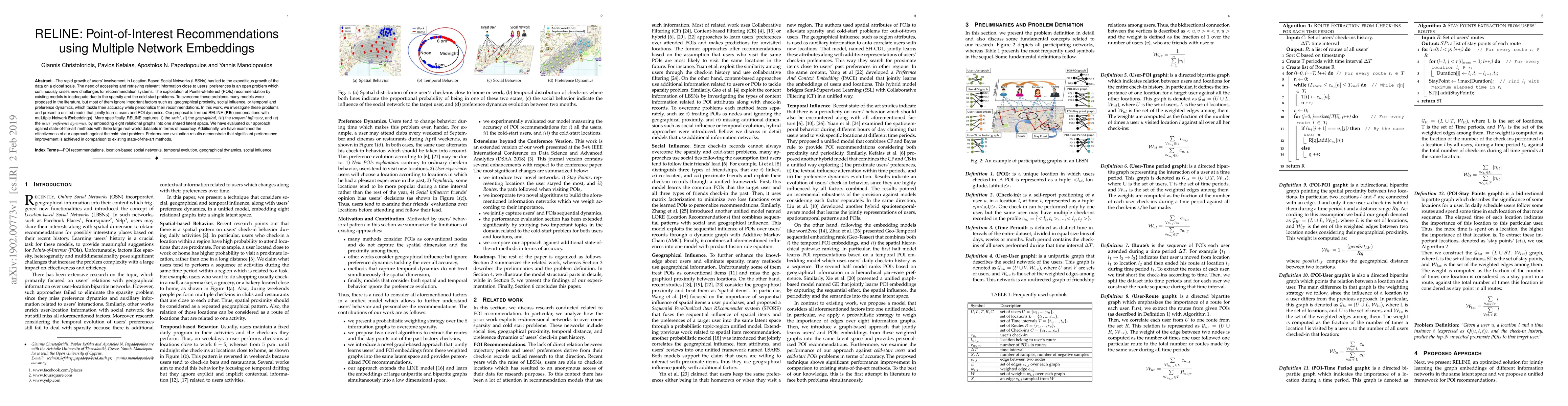 The rapid growth of users' involvement in Location-Based Social Networks (LBSNs) has led to the expeditious growth of the data on a global scale. The need of accessing and retrieving relevant information close to users' preferences is an open problem which continuously raises new challenges for recommendation systems. The exploitation of Points-of-Interest (POIs) recommendation by existing models is inadequate due to the sparsity and the cold start problems. To overcome these problems many models were proposed in the literature, but most of them ignore important factors such as: geographical proximity, social influence, or temporal and preference dynamics, which tackle their accuracy while personalize their recommendations. In this work, we investigate these problems and present a unified model that jointly learns users and POI dynamics. Our proposal is termed RELINE (REcommendations with muLtIple Network Embeddings). More specifically, RELINE captures: i) the social, ii) the geographical, iii) the temporal influence, and iv) the users' preference dynamics, by embedding eight relational graphs into one shared latent space. We have evaluated our approach against state-of-the-art methods with three large real-world datasets in terms of accuracy. Additionally, we have examined the effectiveness of our approach against the cold-start problem. Performance evaluation results demonstrate that significant performance improvement is achieved in comparison to existing state-of-the-art methods.