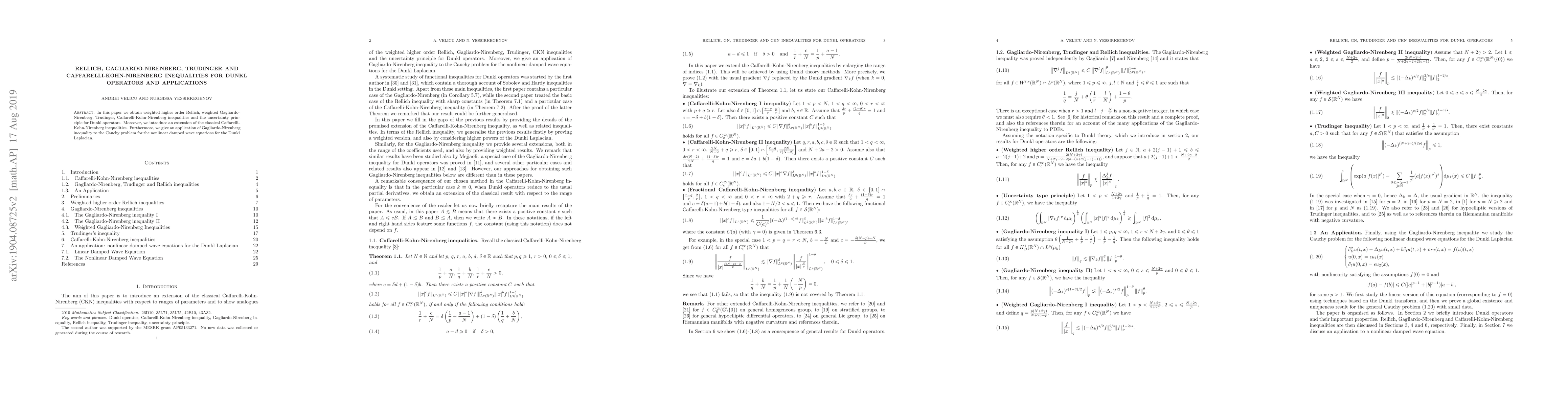 This paper establishes various weighted inequalities for Dunkl operators, including higher order Rellich, Gagliardo-Nirenberg, Trudinger, and Caffarelli-Kohn-Nirenberg inequalities, and applies a Gagliardo-Nirenberg inequality to the Cauchy problem for nonlinear damped wave equations involving the Dunkl Laplacian.