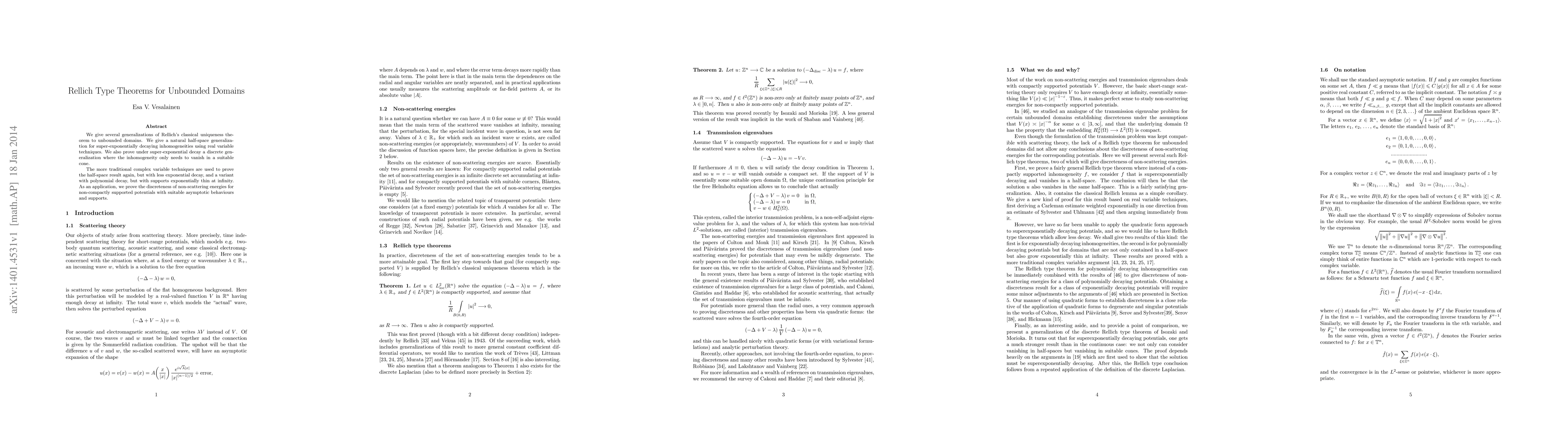 Summary: This paper generalizes Rellich's uniqueness theorem to unbounded domains using real variable techniques for super-exponential decay and traditional complex variable methods for less stringent decay conditions. It also proves a discrete generalization for suitable cone-vanishing inhomogeneities, and applies these results to demonstrate the discreteness of non-scattering energies for non-compactly supported potentials.