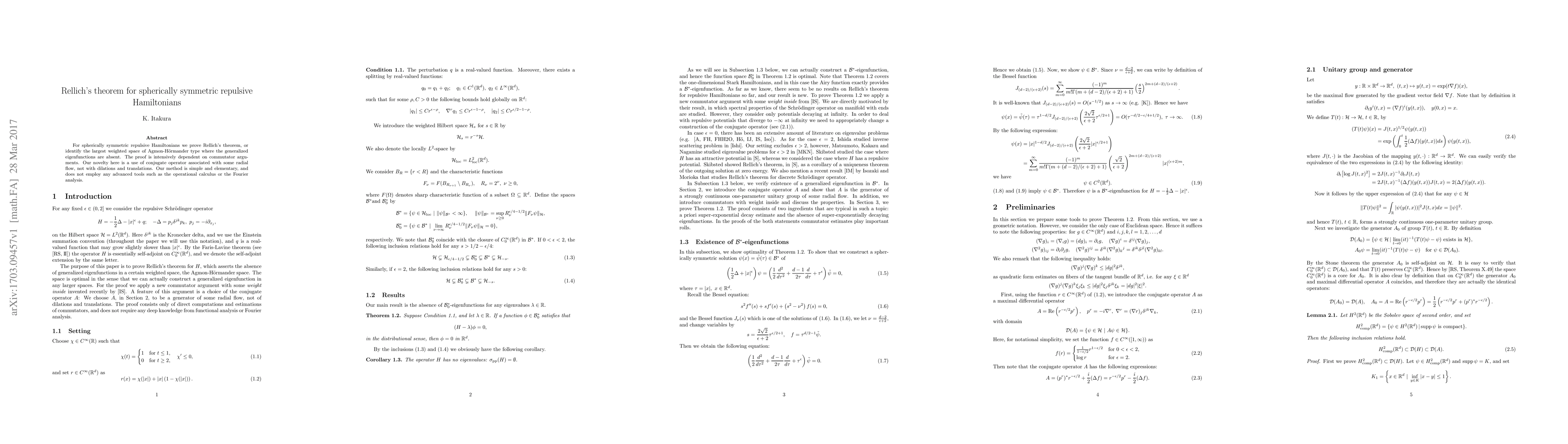 For spherically symmetric repulsive Hamiltonians we prove Rellich's theorem, or identify the largest weighted space of Agmon-H\"ormander type where the generalized eigenfunctions are absent. The proof is intensively dependent on commutator arguments. Our novelty here is a use of conjugate operator associated with some radial flow, not with dilations and translations. Our method is simple and elementary, and does not employ any advanced tools such as the operational calculus or the Fourier analysis.