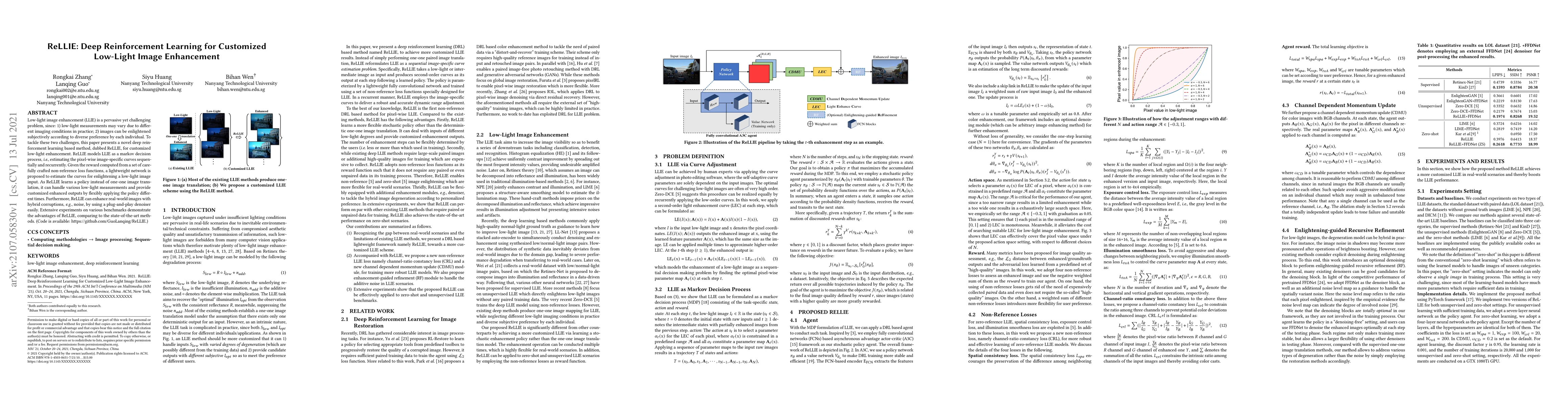 ReLLIE employs deep reinforcement learning to tackle the challenges of customized low-light image enhancement, adapting to varying imaging conditions and individual preferences. It outperforms state-of-the-art methods by learning a flexible policy for diverse low-light scenarios and enhancing images with mixed corruptions.