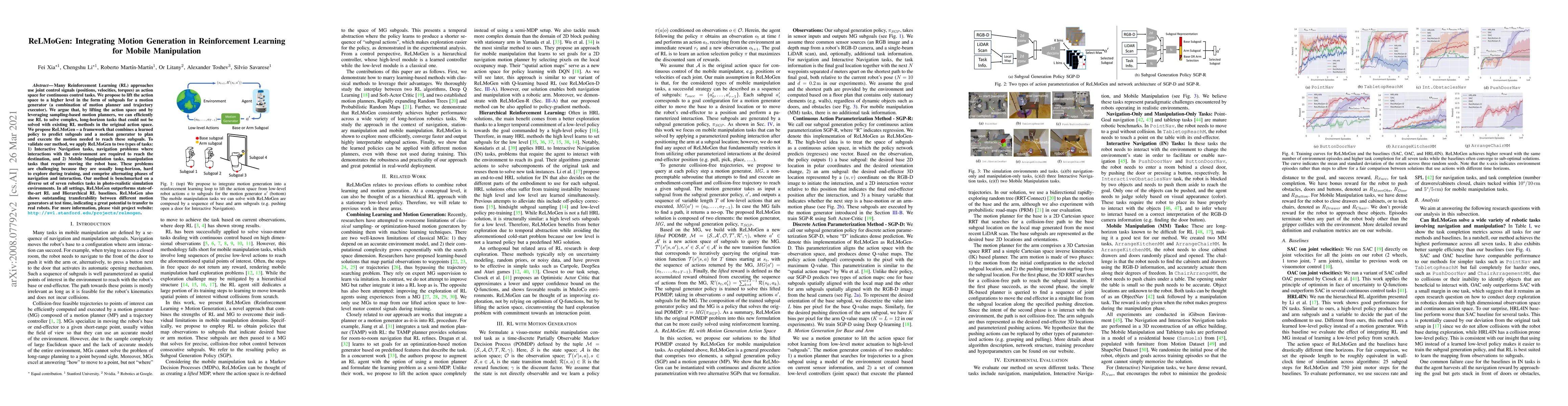 Many Reinforcement Learning (RL) approaches use joint control signals (positions, velocities, torques) as action space for continuous control tasks. We propose to lift the action space to a higher level in the form of subgoals for a motion generator (a combination of motion planner and trajectory executor). We argue that, by lifting the action space and by leveraging sampling-based motion planners, we can efficiently use RL to solve complex, long-horizon tasks that could not be solved with existing RL methods in the original action space. We propose ReLMoGen -- a framework that combines a learned policy to predict subgoals and a motion generator to plan and execute the motion needed to reach these subgoals. To validate our method, we apply ReLMoGen to two types of tasks: 1) Interactive Navigation tasks, navigation problems where interactions with the environment are required to reach the destination, and 2) Mobile Manipulation tasks, manipulation tasks that require moving the robot base. These problems are challenging because they are usually long-horizon, hard to explore during training, and comprise alternating phases of navigation and interaction. Our method is benchmarked on a diverse set of seven robotics tasks in photo-realistic simulation environments. In all settings, ReLMoGen outperforms state-of-the-art Reinforcement Learning and Hierarchical Reinforcement Learning baselines. ReLMoGen also shows outstanding transferability between different motion generators at test time, indicating a great potential to transfer to real robots.