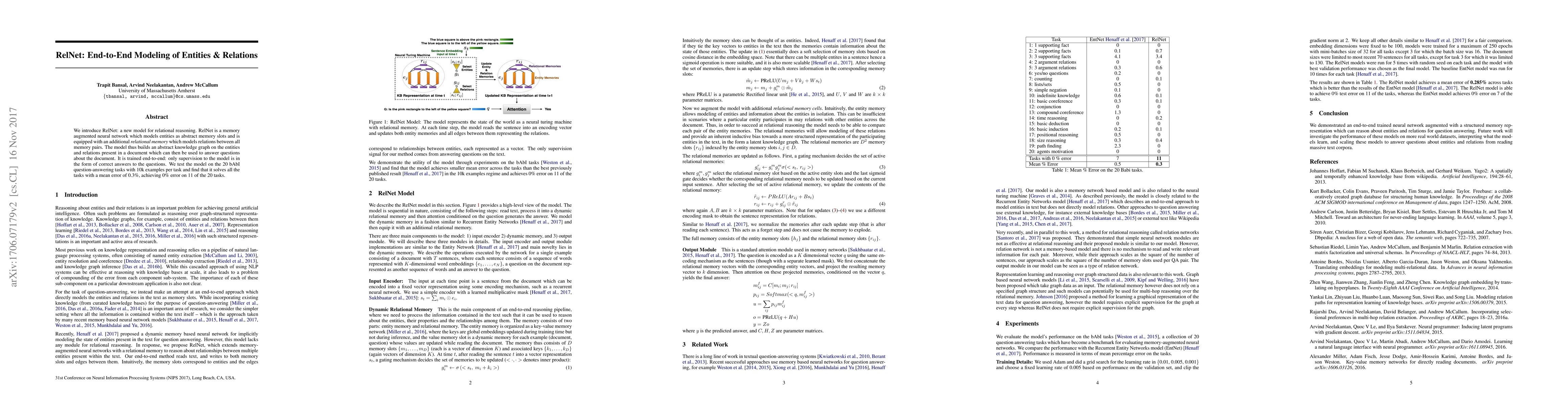 We introduce RelNet: a new model for relational reasoning. RelNet is a memory augmented neural network which models entities as abstract memory slots and is equipped with an additional relational memory which models relations between all memory pairs. The model thus builds an abstract knowledge graph on the entities and relations present in a document which can then be used to answer questions about the document. It is trained end-to-end: only supervision to the model is in the form of correct answers to the questions. We test the model on the 20 bAbI question-answering tasks with 10k examples per task and find that it solves all the tasks with a mean error of 0.3%, achieving 0% error on 11 of the 20 tasks.