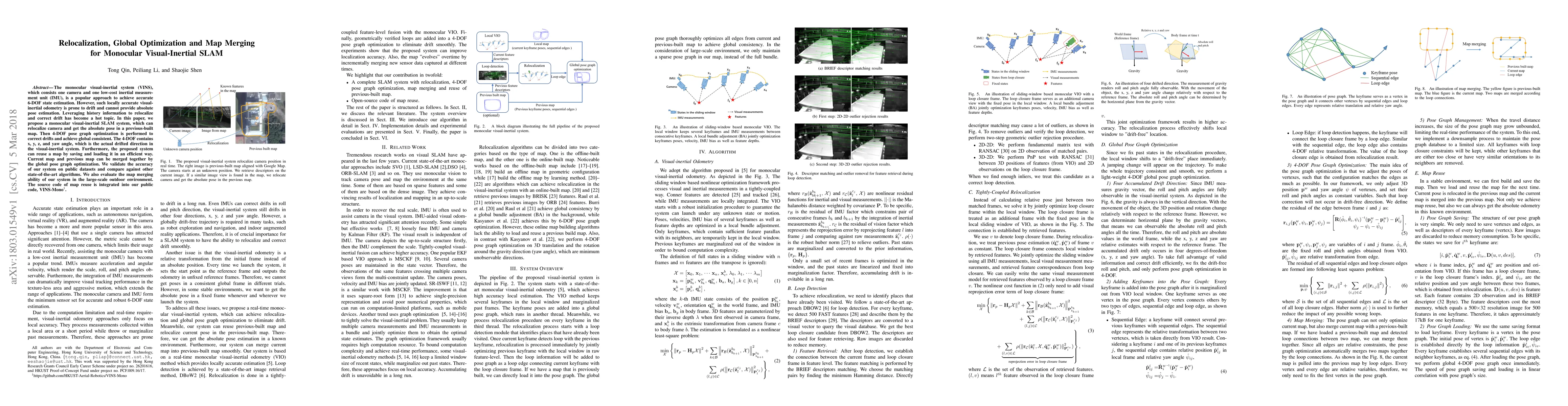 This paper presents a monocular visual-inertial SLAM system that relocalizes the camera and corrects drift through global optimization and map merging. The system achieves 4-DOF pose graph optimization for global consistency and efficiently reuses and merges maps, validated on public datasets and large-scale outdoor environments.