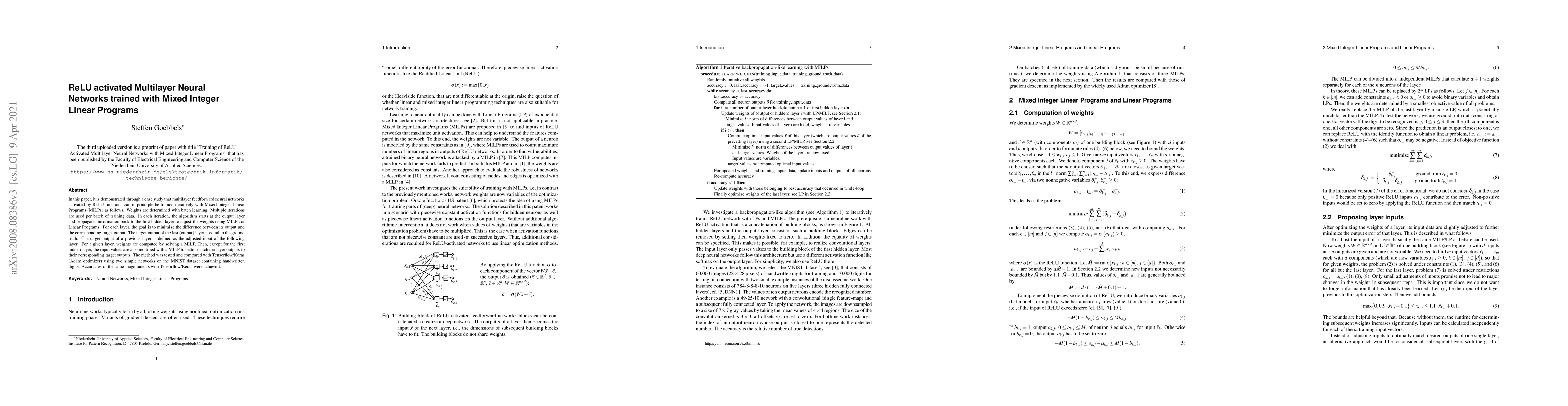 This paper demonstrates that ReLU-activated multilayer neural networks can be trained using Mixed Integer Linear Programs (MILPs) to iteratively adjust weights, achieving similar accuracy to TensorFlow/Keras on the MNIST dataset. The training involves propagating information backward from the output layer to adjust weights and inputs via MILP optimization.
