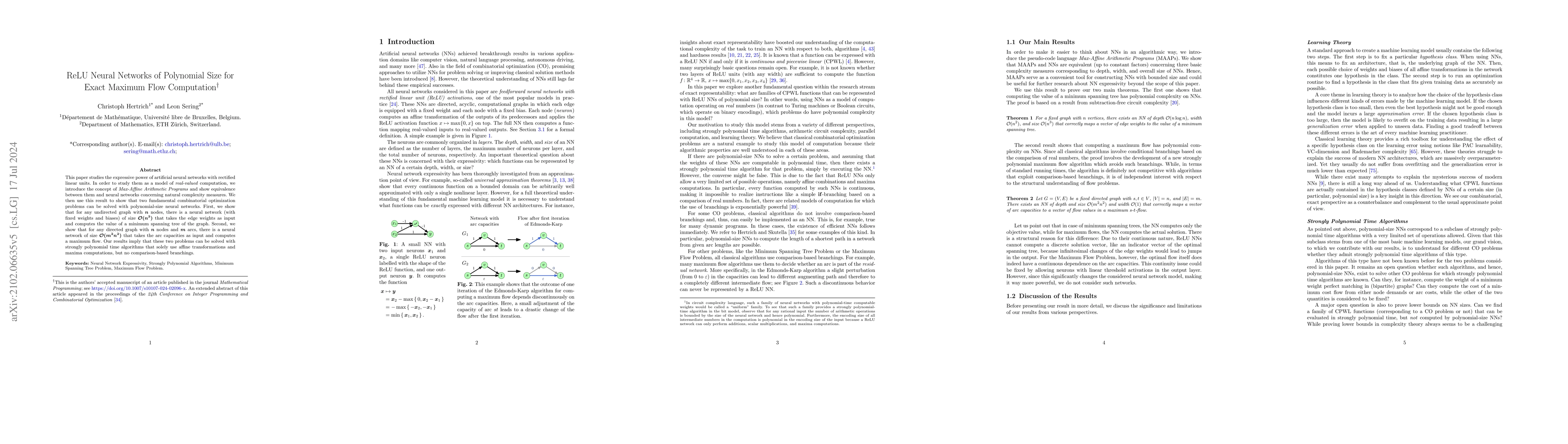 This paper studies the expressive power of artificial neural networks with rectified linear units. In order to study them as a model of real-valued computation, we introduce the concept of Max-Affine Arithmetic Programs and show equivalence between them and neural networks concerning natural complexity measures. We then use this result to show that two fundamental combinatorial optimization problems can be solved with polynomial-size neural networks. First, we show that for any undirected graph with $n$ nodes, there is a neural network (with fixed weights and biases) of size $\mathcal{O}(n^3)$ that takes the edge weights as input and computes the value of a minimum spanning tree of the graph. Second, we show that for any directed graph with $n$ nodes and $m$ arcs, there is a neural network of size $\mathcal{O}(m^2n^2)$ that takes the arc capacities as input and computes a maximum flow. Our results imply that these two problems can be solved with strongly polynomial time algorithms that solely use affine transformations and maxima computations, but no comparison-based branchings.