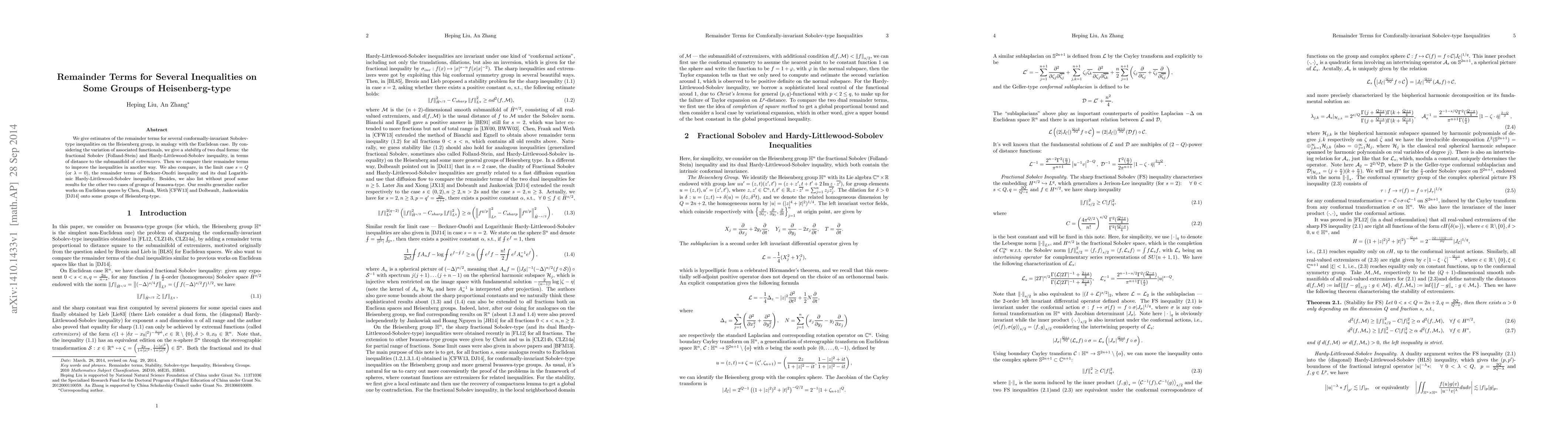 We give some estimates of the remainder terms for several conformally-invariant Sobolev-type inequalities on the Heisenberg group, in analogy with the Euclidean case. By considering the variation of associated functionals, we give a stability of two dual forms: the fractional Sobolev (Folland-Stein) and Hardy-Littlewood-Sobolev inequality, in terms of distance to the submanifold of extremizers. Then we compare their remainder terms to improve the inequalities in another way. We also compare, in the limit case s = Q (or $\lambda$ = 0), the remainder terms of Beckner-Onofri inequality and its dual Logarithmic Hardy-Littlewood-Sobolev inequality. Besides, we also list without proof some results for the other two cases of groups of Iwasawa-type. Our results generalize earlier works on Euclidean spaces by Chen, Frank, Weth [CFW13] and Dolbeault, Jankowiakin [DJ14] onto some groups of Heisenberg-type.