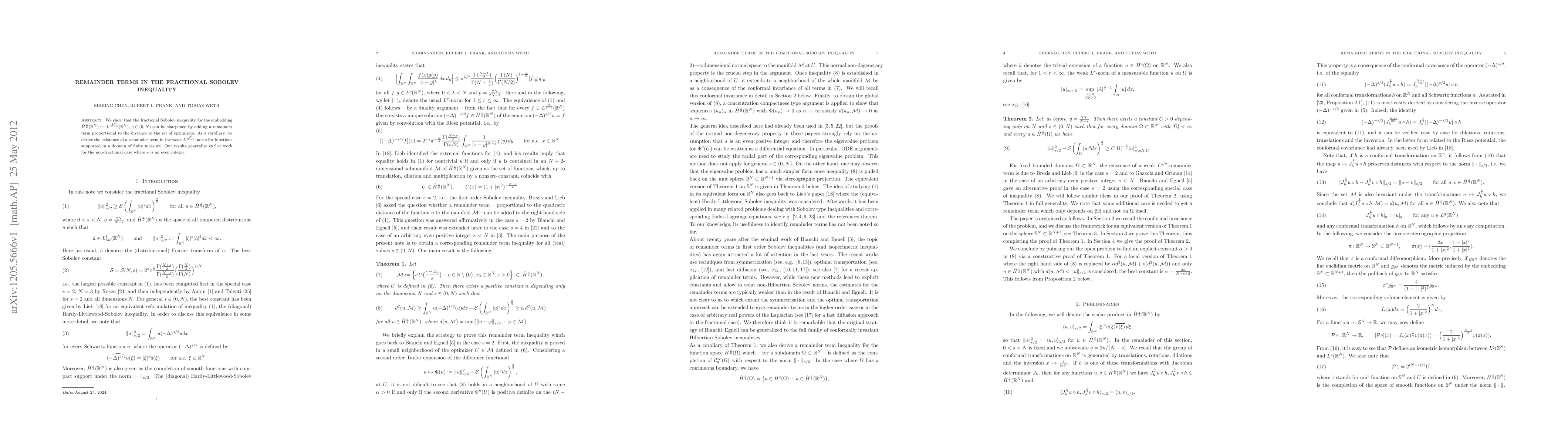 We show that the fractional Sobolev inequality for the embedding $\H \hookrightarrow L^{\frac{2N}{N-s}}(\R^N)$, $s \in (0,N)$ can be sharpened by adding a remainder term proportional to the distance to the set of optimizers. As a corollary, we derive the existence of a remainder term in the weak $L^{\frac{N}{N-s}}$-norm for functions supported in a domain of finite measure. Our results generalize earlier work for the non-fractional case where $s$ is an even integer.