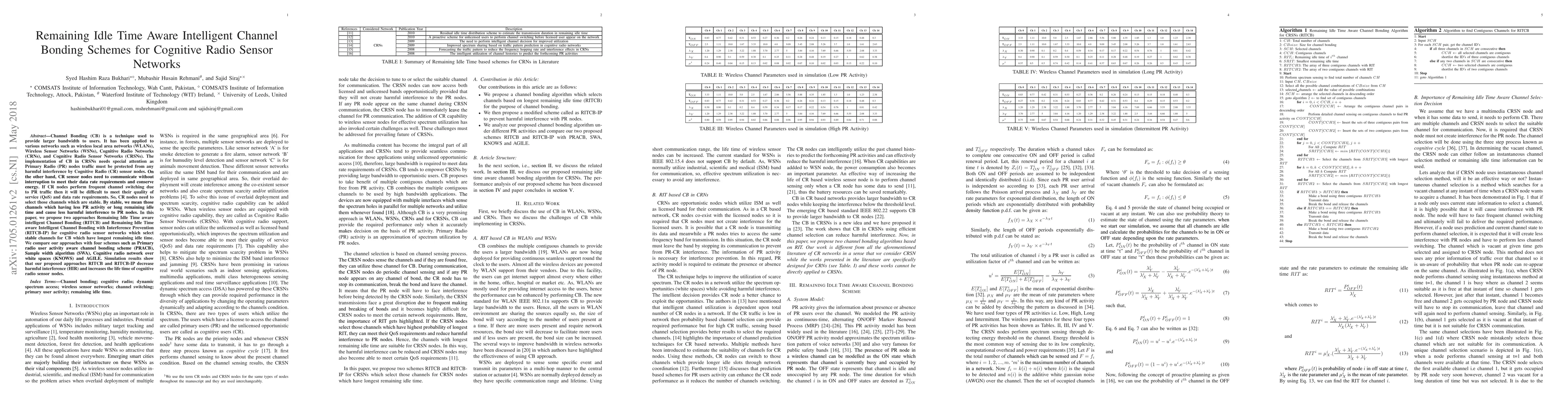 Channel Bonding (CB) is a technique used to provide larger bandwidth to users. It has been applied to various networks such as wireless local area networks (WLANs), Wireless Sensor Networks (WSNs), Cognitive Radio Networks (CRNs), and Cognitive Radio Sensor Networks (CRSNs). The implementation of CB in CRSNs needs special attention as Primary Radio (PR) nodes traffic must be protected from any harmful interference by Cognitive Radio (CR) nodes. On the other hand, CR nodes need to communicate without interruption to meet their data rate requirements. If CR nodes perform frequent channel switching due to PR traffic then it will be difficult to meet their quality of service (QoS) and data rate requirements. So, CR nodes need to select those channels which are stable. By stable, we mean those channels which cause less harmful interference to PR nodes and having less PR activity or long remaining idle time. In this paper, we propose our two approaches Remaining Idle Time aware intelligent Channel Bonding (RITCB) and Remaining Idle Time aware Intelligent Channel Bonding with Interference Prevention (RITCB-IP) for cognitive radio sensor networks which select those channels for CB which have longest remaining idle time. We compare our approaches with four schemes PRACB, SWA, KNOWS and AGILE. Simulation results show that our proposed approaches RITCB and RITCB-IP decrease harmful interference (HIR) and increases the life time of cognitive radio sensor nodes.