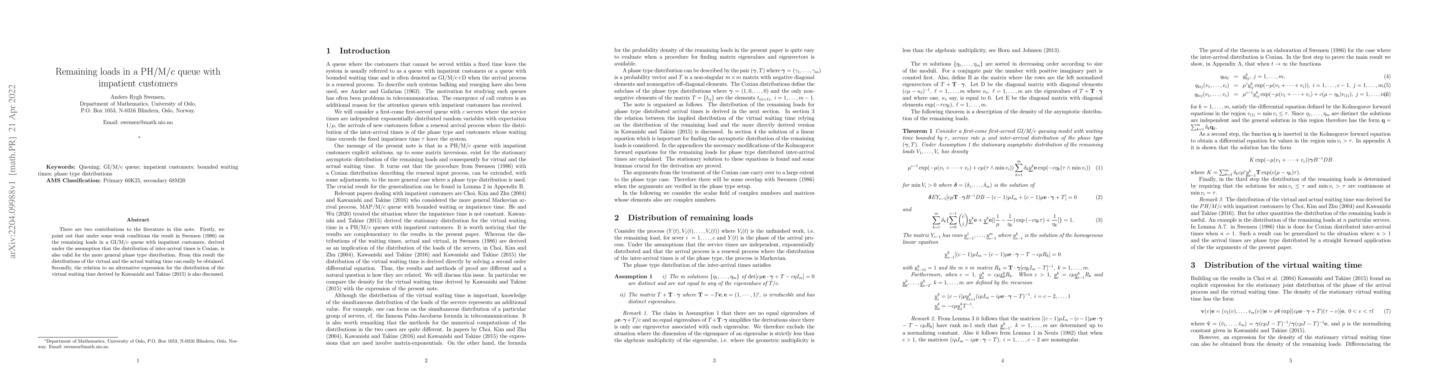 This paper extends the result of Swensen (1986) on remaining loads in a PH/M/c queue with impatient customers, showing it holds for general phase type distributions rather than just Coxian. It also discusses the relationship between this result and an alternative expression for virtual waiting time derived by Kawanishi and Takine (2015).