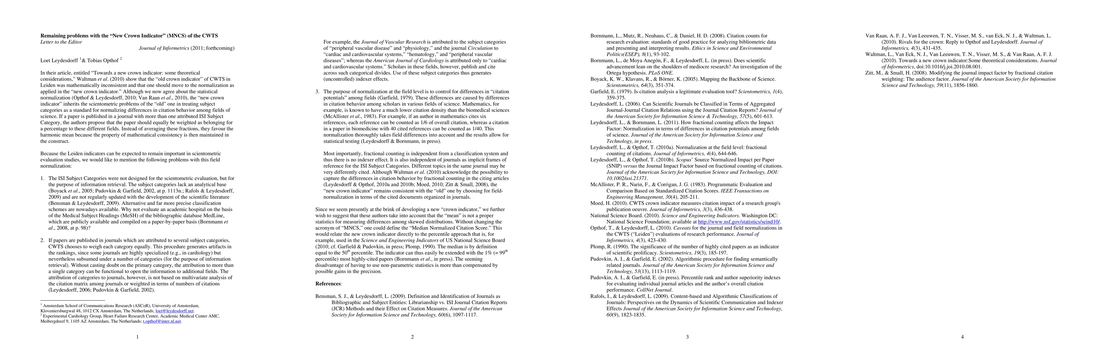 In their article, entitled "Towards a new crown indicator: some theoretical considerations," Waltman et al. (2010; at arXiv:1003.2167) show that the "old crown indicator" of CWTS in Leiden was mathematically inconsistent and that one should move to the normalization as applied in the "new crown indicator." Although we now agree about the statistical normalization, the "new crown indicator" inherits the scientometric problems of the "old" one in treating subject categories of journals as a standard for normalizing differences in citation behavior among fields of science. We further note that the "mean" is not a proper statistics for measuring differences among skewed distributions. Without changing the acronym of "MNCS," one could define the "Median Normalized Citation Score." This would relate the new crown indicator directly to the percentile approach that is, for example, used in the Science and Engineering Indicators of US National Science Board (2010). The median is by definition equal to the 50th percentile. The indicator can thus easily be extended with the 1% (= 99th percentile) most highly-cited papers (Bornmann et al., in press). The seeming disadvantage of having to use non-parametric statistics is more than compensated by possible gains in the precision.