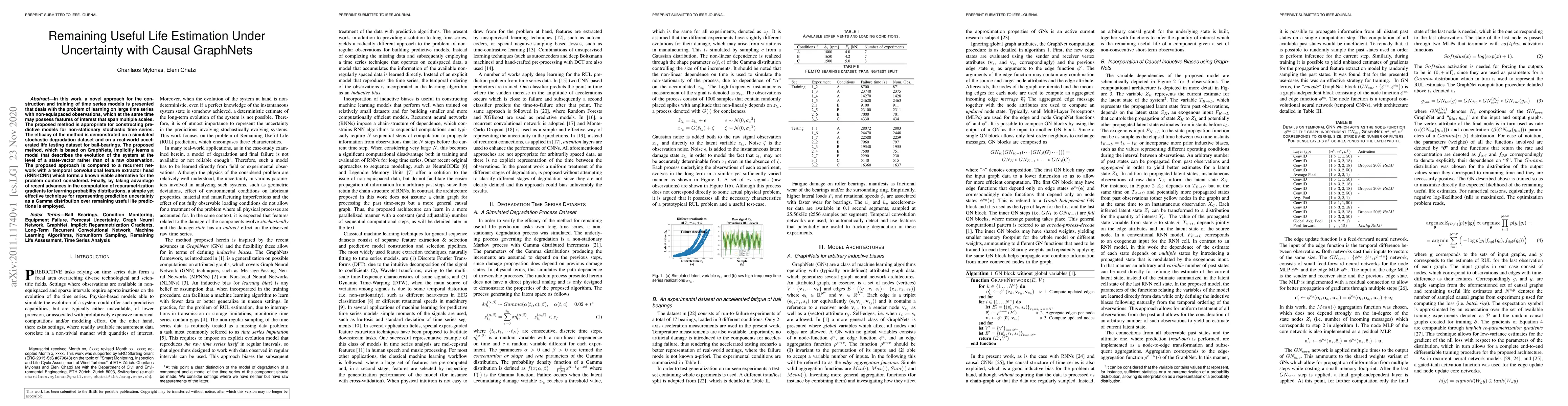 In this work, a novel approach for the construction and training of time series models is presented that deals with the problem of learning on large time series with non-equispaced observations, which at the same time may possess features of interest that span multiple scales. The proposed method is appropriate for constructing predictive models for non-stationary stochastic time series.The efficacy of the method is demonstrated on a simulated stochastic degradation dataset and on a real-world accelerated life testing dataset for ball-bearings. The proposed method, which is based on GraphNets, implicitly learns a model that describes the evolution of the system at the level of a state-vector rather than of a raw observation. The proposed approach is compared to a recurrent network with a temporal convolutional feature extractor head (RNN-tCNN) which forms a known viable alternative for the problem context considered. Finally, by taking advantage of recent advances in the computation of reparametrization gradients for learning probability distributions, a simple yet effective technique for representing prediction uncertainty as a Gamma distribution over remaining useful life predictions is employed.