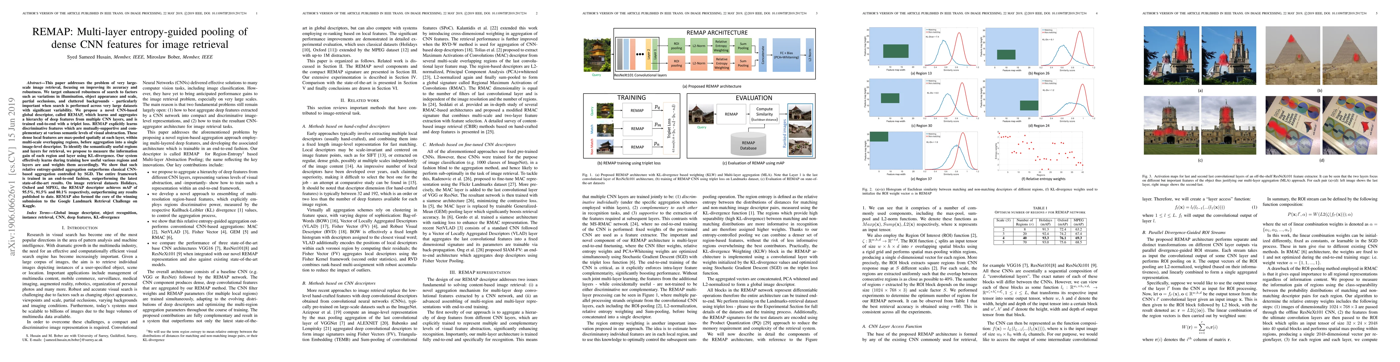 This paper addresses the problem of very large-scale image retrieval, focusing on improving its accuracy and robustness. We target enhanced robustness of search to factors such as variations in illumination, object appearance and scale, partial occlusions, and cluttered backgrounds - particularly important when search is performed across very large datasets with significant variability. We propose a novel CNN-based global descriptor, called REMAP, which learns and aggregates a hierarchy of deep features from multiple CNN layers, and is trained end-to-end with a triplet loss. REMAP explicitly learns discriminative features which are mutually-supportive and complementary at various semantic levels of visual abstraction. These dense local features are max-pooled spatially at each layer, within multi-scale overlapping regions, before aggregation into a single image-level descriptor. To identify the semantically useful regions and layers for retrieval, we propose to measure the information gain of each region and layer using KL-divergence. Our system effectively learns during training how useful various regions and layers are and weights them accordingly. We show that such relative entropy-guided aggregation outperforms classical CNN-based aggregation controlled by SGD. The entire framework is trained in an end-to-end fashion, outperforming the latest state-of-the-art results. On image retrieval datasets Holidays, Oxford and MPEG, the REMAP descriptor achieves mAP of 95.5%, 91.5%, and 80.1% respectively, outperforming any results published to date. REMAP also formed the core of the winning submission to the Google Landmark Retrieval Challenge on Kaggle.
