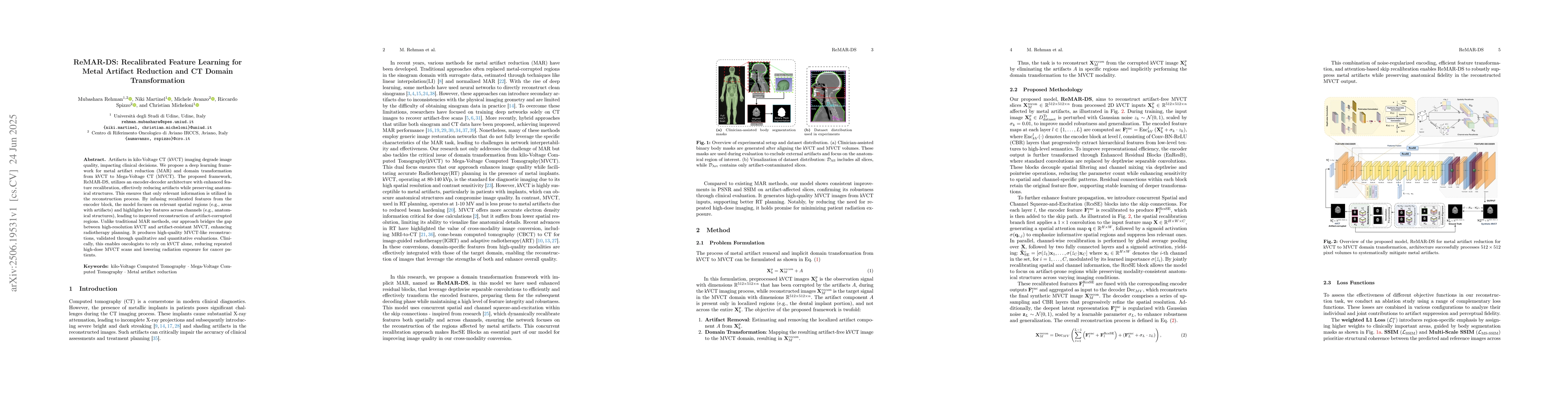 Artifacts in kilo-Voltage CT (kVCT) imaging degrade image quality, impacting clinical decisions. We propose a deep learning framework for metal artifact reduction (MAR) and domain transformation from kVCT to Mega-Voltage CT (MVCT). The proposed framework, ReMAR-DS, utilizes an encoder-decoder architecture with enhanced feature recalibration, effectively reducing artifacts while preserving anatomical structures. This ensures that only relevant information is utilized in the reconstruction process. By infusing recalibrated features from the encoder block, the model focuses on relevant spatial regions (e.g., areas with artifacts) and highlights key features across channels (e.g., anatomical structures), leading to improved reconstruction of artifact-corrupted regions. Unlike traditional MAR methods, our approach bridges the gap between high-resolution kVCT and artifact-resistant MVCT, enhancing radiotherapy planning. It produces high-quality MVCT-like reconstructions, validated through qualitative and quantitative evaluations. Clinically, this enables oncologists to rely on kVCT alone, reducing repeated high-dose MVCT scans and lowering radiation exposure for cancer patients.