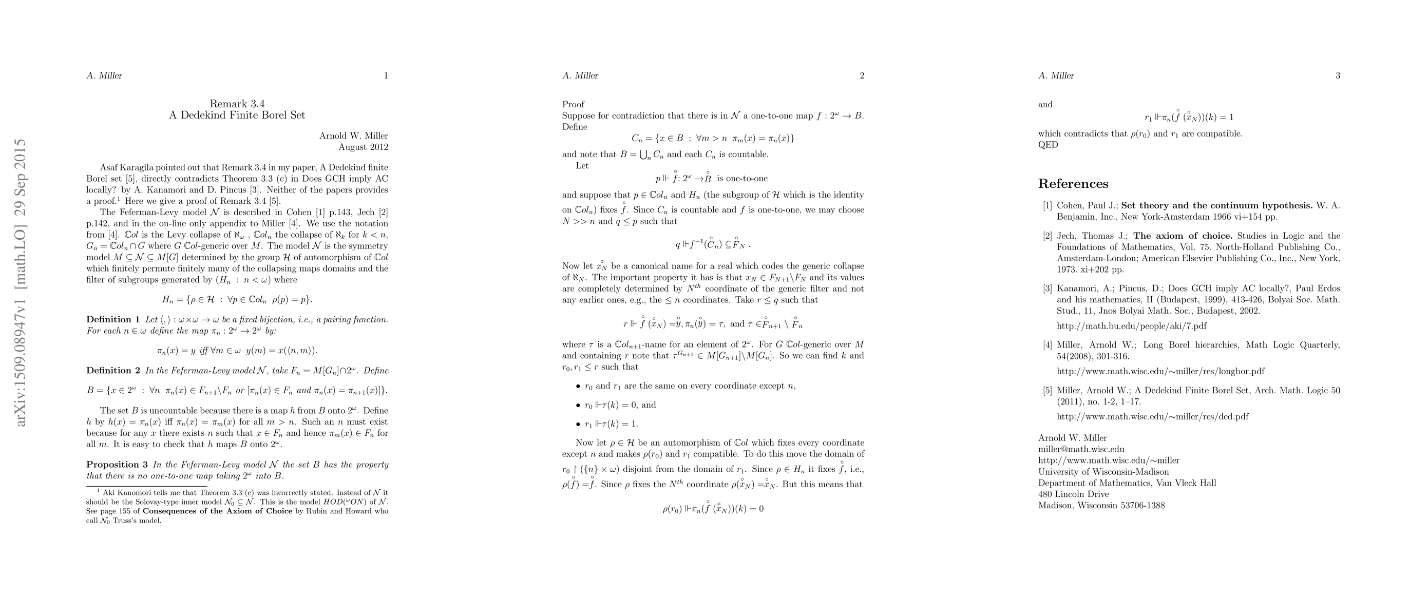 Asaf Karagila pointed out that Remark 3.4 [1], directly contradicts Theorem 3.3 (c) [2] which was incorrectly stated. This note contains a proof of this remark. [1] Miller, Arnold W.; A Dedekind Finite Borel Set, Arch. Math. Logic 50 (2011), no. 1-2, 1--17. [2] Kanamori, A.; Pincus, D.; Does GCH imply AC locally?, Paul Erdos and his mathematics, II (Budapest, 1999), 413-426, Bolyai Soc. Math. Stud., 11, Janos Bolyai Math. Soc., Budapest, 2002.