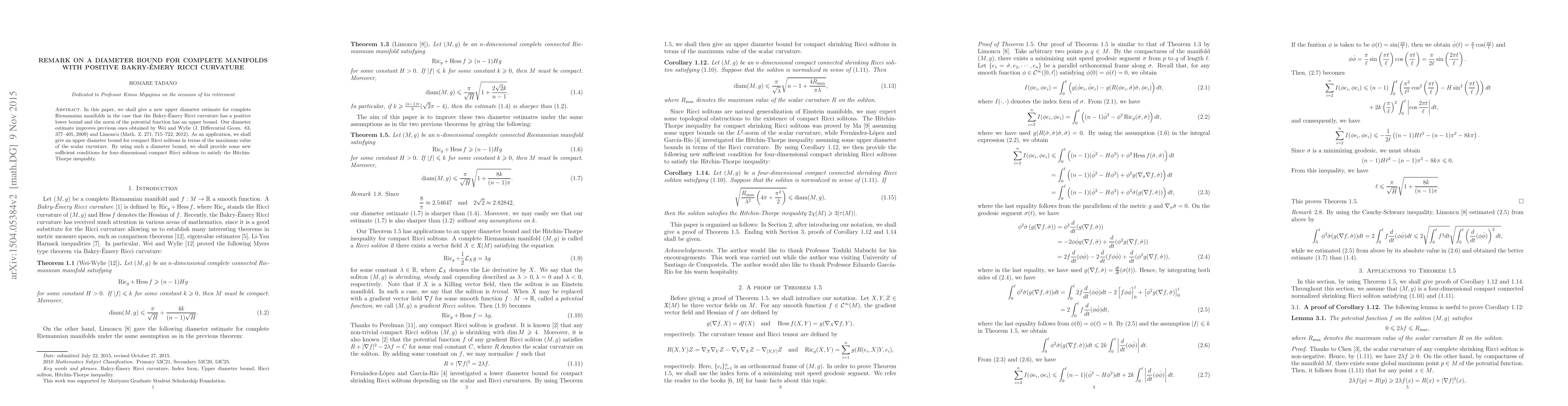 This paper introduces an improved upper diameter estimate for complete Riemannian manifolds with positive Bakry-Émery Ricci curvature and bounded potential function, surpassing previous results by Wei and Wylie and Limoncu. It also applies this new estimate to derive bounds for compact Ricci solitons and conditions for four-dimensional compact Ricci solitons to meet the Hitchin-Thorpe inequality.