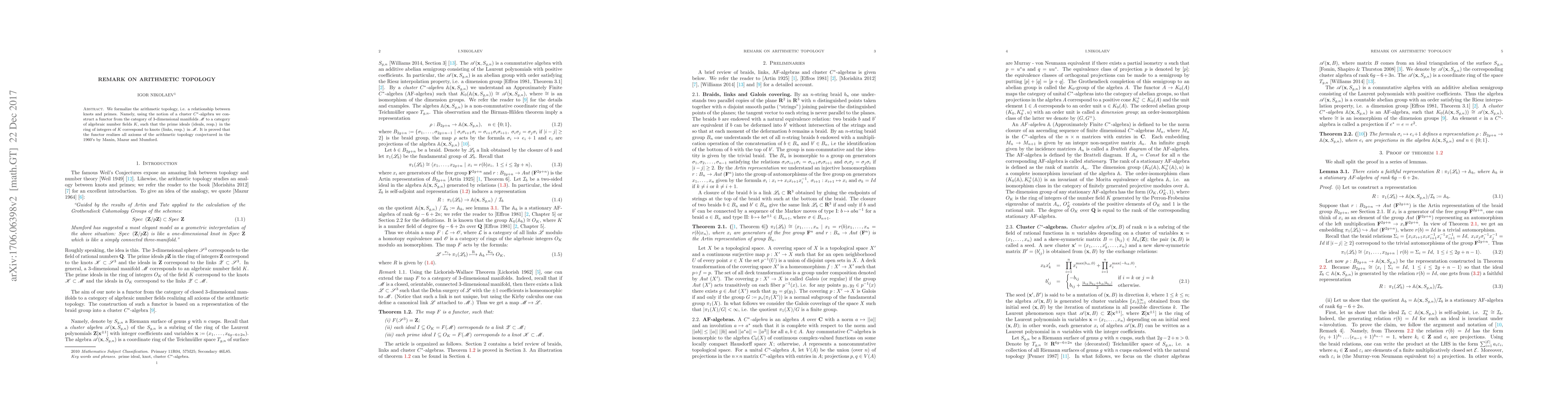 We formalize the arithmetic topology, i.e. a relationship between knots and primes. Namely, using the notion of a cluster C*-algebra we construct a functor from the category of 3-dimensional manifolds M to a category of algebraic number fields K, such that the prime ideals (ideals, resp.) in the ring of integers of K correspond to knots (links, resp.) in M. It is proved that the functor realizes all axioms of the arithmetic topology conjectured in the 1960's by Manin, Mazur and Mumford.