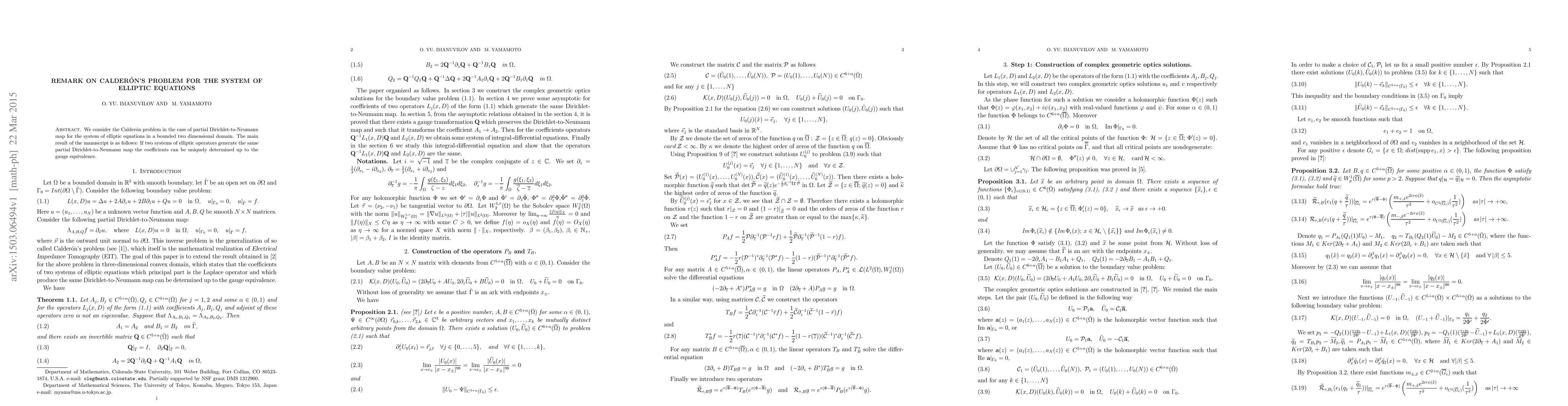 We consider the Calder\'on problem in the case of partial Dirichlet-to-Neumann map for the system of elliptic equations in a bounded two dimensional domain. The main result of the manuscript is as follows: If two systems of elliptic operators generate the same partial Dirichlet-to-Neumann map the coefficients can be uniquely determined up to the gauge equivalence.