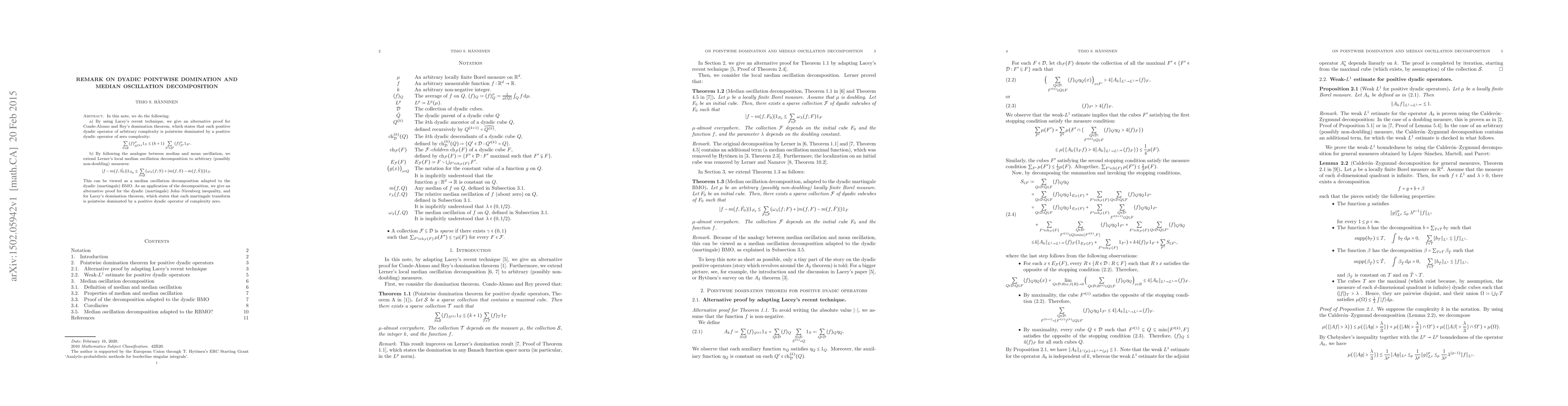 In this note, we do the following: a) By using Lacey's recent technique, we give an alternative proof for Conde-Alonso and Rey's domination theorem, which states that each positive dyadic operator of arbitrary complexity is pointwise dominated by a positive dyadic operator of zero complexity: \[ \sum_{S\in\mathcal{S}} \langle f \rangle^\mu_{S^{(k)}} 1_S\lesssim (k+1) \sum_{S'\in\mathcal{S}'} \langle f \rangle^\mu_{S'} 1_{S'}. \] b) By following the analogue between median and mean oscillation, we extend Lerner's local median oscillation decomposition to arbitrary (possibly non-doubling) measures: \[\lvert f-m(f,\hat{S_0})\rvert 1_{S_0}\lesssim \sum_{S\in\mathcal{S}} (\omega_\lambda(f;S)+\lvert m(f,S)-m(f,\hat{S}) \rvert )1_S.\] This can be viewed as a median oscillation decomposition adapted to the dyadic (martingale) BMO. As an application of the decomposition, we give an alternative proof for the dyadic (martingale) John--Nirenberg inequality, and for Lacey's domination theorem, which states that each martingale transform is pointwise dominated by a positive dyadic operator of complexity zero.