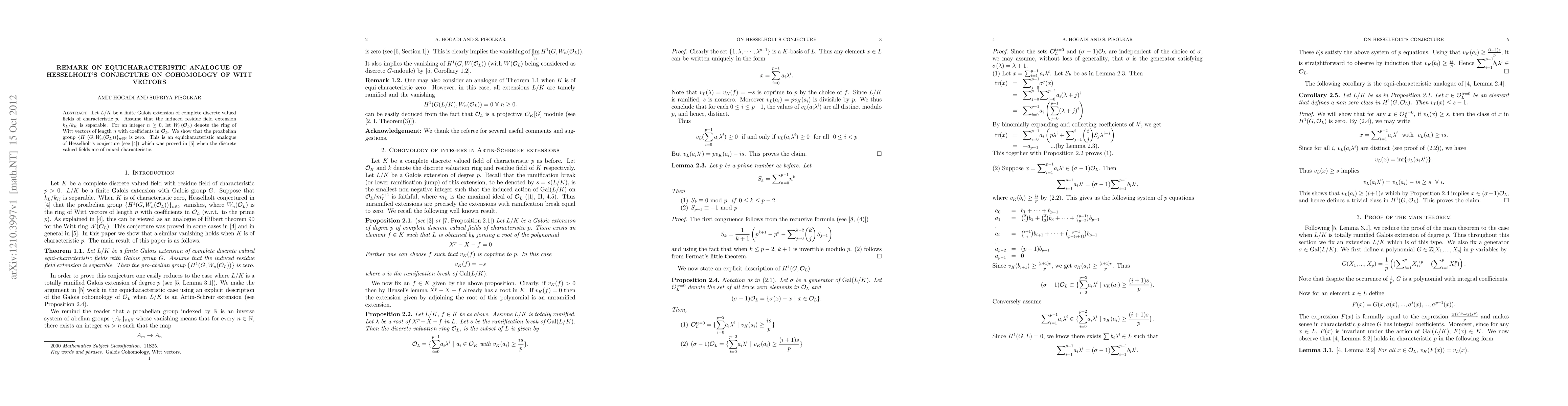 Let $L/K$ be a finite Galois extension of complete discrete valued fields of characteristic $p$. Assume that the induced residue field extension $k_L/k_K$ is separable. For an integer $n\geq 0$, let $W_n(\sO_L)$ denote the ring of Witt vectors of length $n$ with coefficients in $\sO_L$. We show that the proabelian group ${H^1(G,W_n(\sO_L))}_{n\in \N}$ is zero. This is an equicharacteristic analogue of Hesselholt's conjecture.