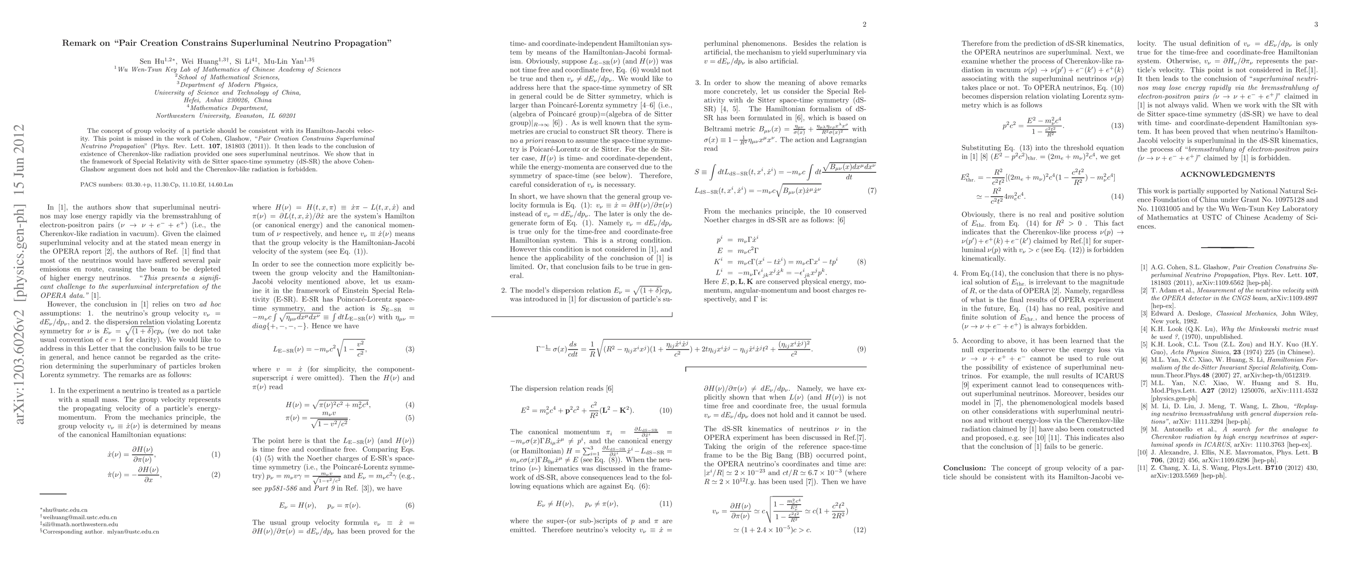 The concept of group velocity of a particle should be consistent with its Hamilton-Jacobi velocity. This point is missed in the work of Cohen, Glashow, "{\it Pair Creation Constrains Superluminal Neutrino Propagation}" (Phys. Rev. Lett. {\bf 107}, 181803 (2011)). It then leads to the conclusion of existence of Cherenkov-like radiation provided one sees superluminal neutrinos. We show that in the framework of Special Relativity with de Sitter space-time symmetry (dS-SR) the above Cohen-Glashow argument does not hold and the Cherenkov-like radiation is forbidden. Our result is consistent with the experimental results of the ICARUS Collaboration.