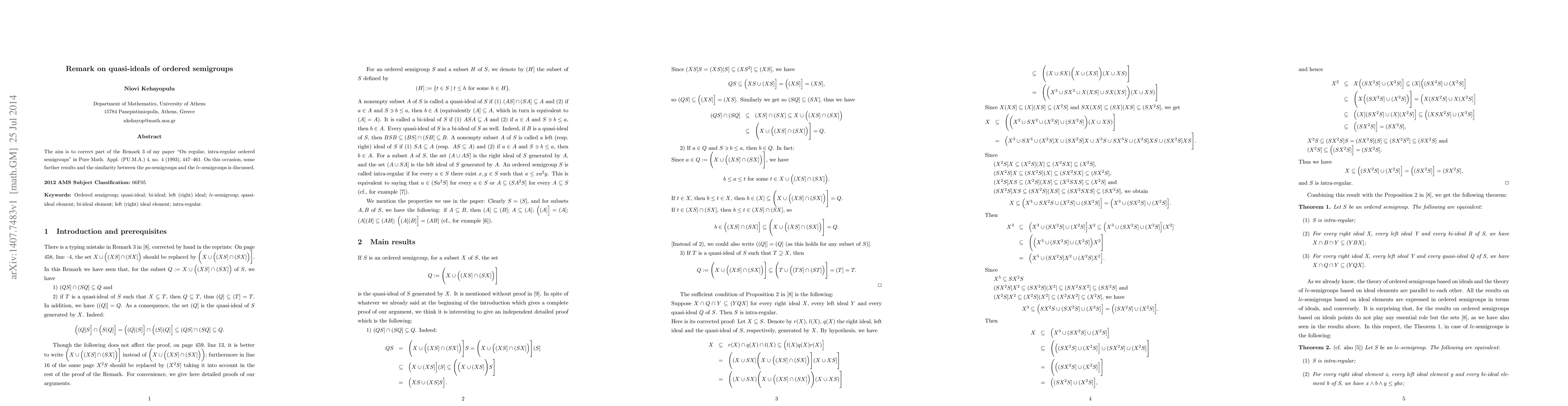 The aim is to correct part of the Remark 3 of my paper "On regular, intra-regular ordered semigroups" in Pure Math. Appl. (PU.M.A.) 4, no. 4 (1993), 447--461. On this occasion, some further results and the similarity between the $po$-semigroups and the $le$-semigroups is discussed.