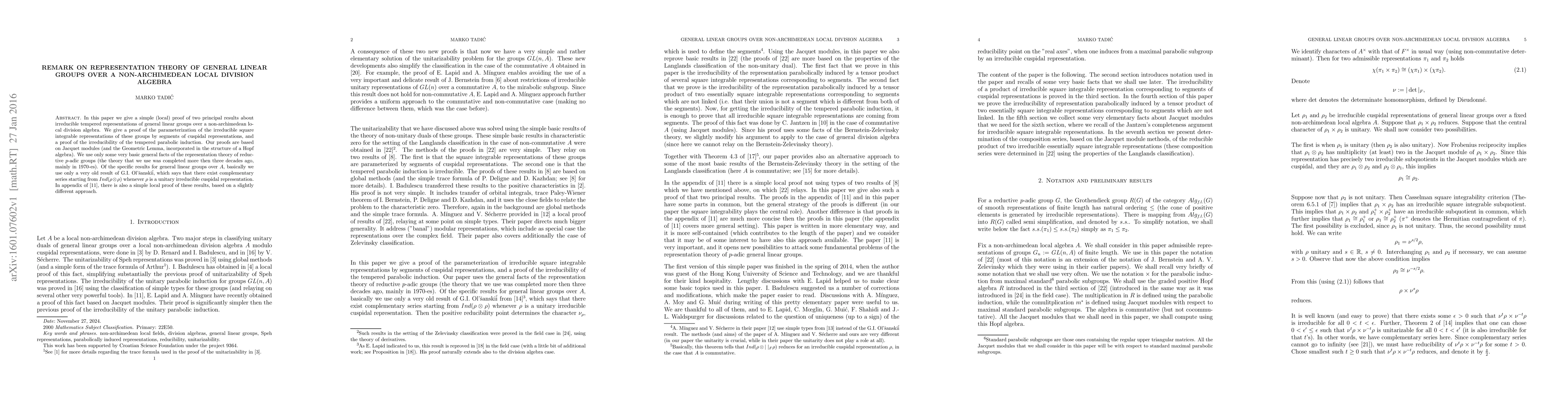 This paper presents a straightforward local proof for two key results on irreducible tempered representations of general linear groups over non-archimedean local division algebras, utilizing Jacquet modules and the Geometric Lemma. It also references a complementary series result by G.I. Olshanskii.