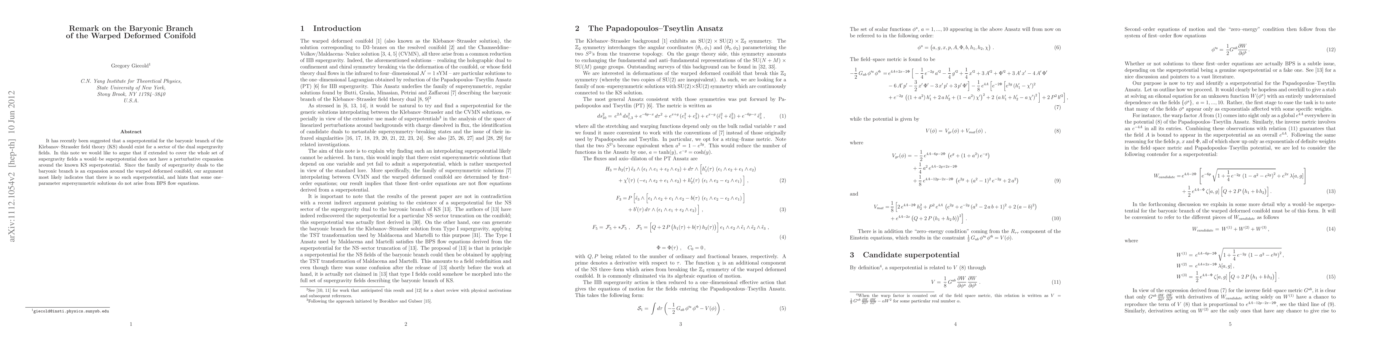 This paper argues that a proposed superpotential for the baryonic branch of the Klebanov-Strassler field theory does not exist when extended to cover all supergravity fields, suggesting a lack of one-parameter supersymmetric solutions derived from BPS flow equations. The absence of such a superpotential is inferred from the family of supergravity duals expanding around the warped deformed conifold.
