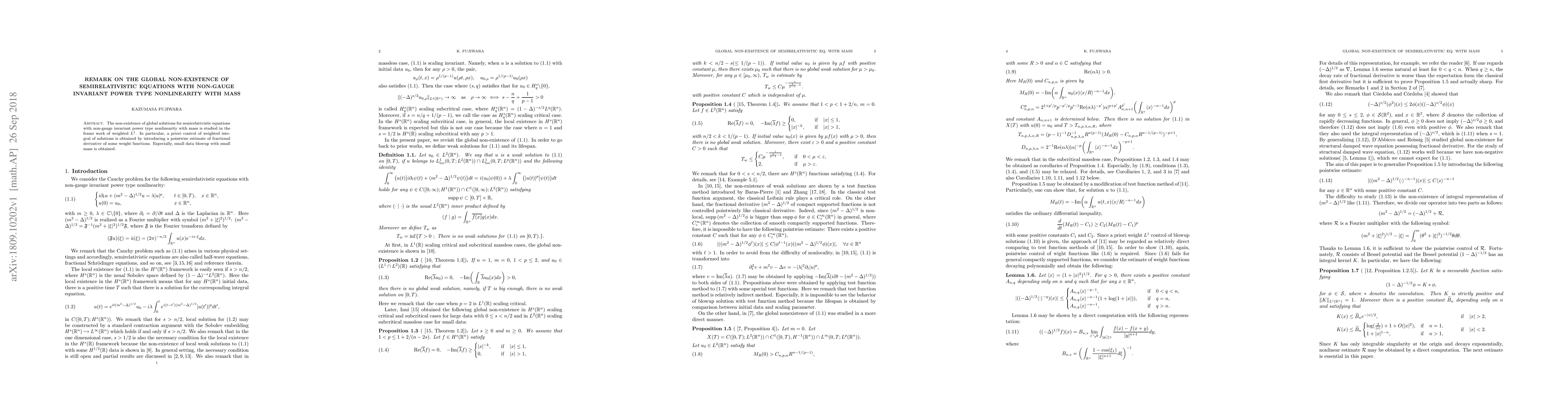 The non-existence of global solutions for semirelativistic equations with non-gauge invariant power type nonlinearity with mass is studied in the frame work of weighted $L^1$. In particular, a priori control of weighted integral of solutions is obtained by introducing a pointwise estimate of fractional derivative of some weight functions. Especially, small data blowup with small mass is obtained.