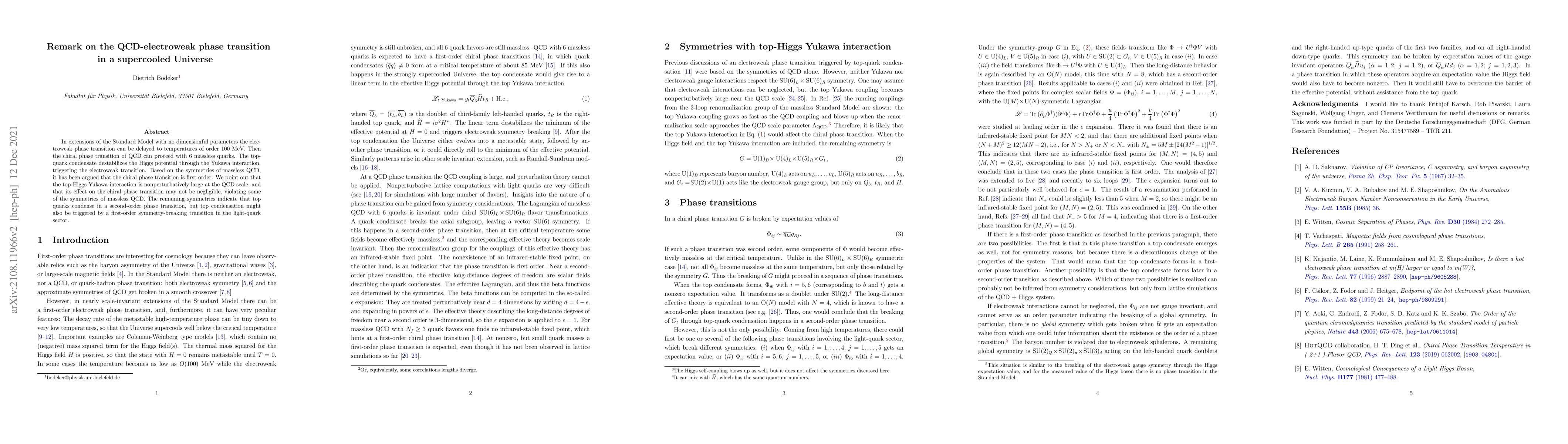 In extensions of the Standard Model with no dimensionful parameters the electroweak phase transition can be delayed to temperatures of order 100 MeV. Then the chiral phase transition of QCD can proceed with 6 massless quarks. The top-quark condensate destabilizes the Higgs potential through the Yukawa interaction, triggering the electroweak transition. Based on the symmetries of massless QCD, it has been argued that the chiral phase transition is first order. We point out that the top-Higgs Yukawa interaction is nonperturbatively large at the QCD scale, and that its effect on the chiral phase transition may not be negligible, violating some of the symmetries of massless QCD. The remaining symmetries indicate that top quarks condense in a second-order phase transition, but top condensation might also be triggered by a first-order symmetry-breaking transition in the light-quark sector.
