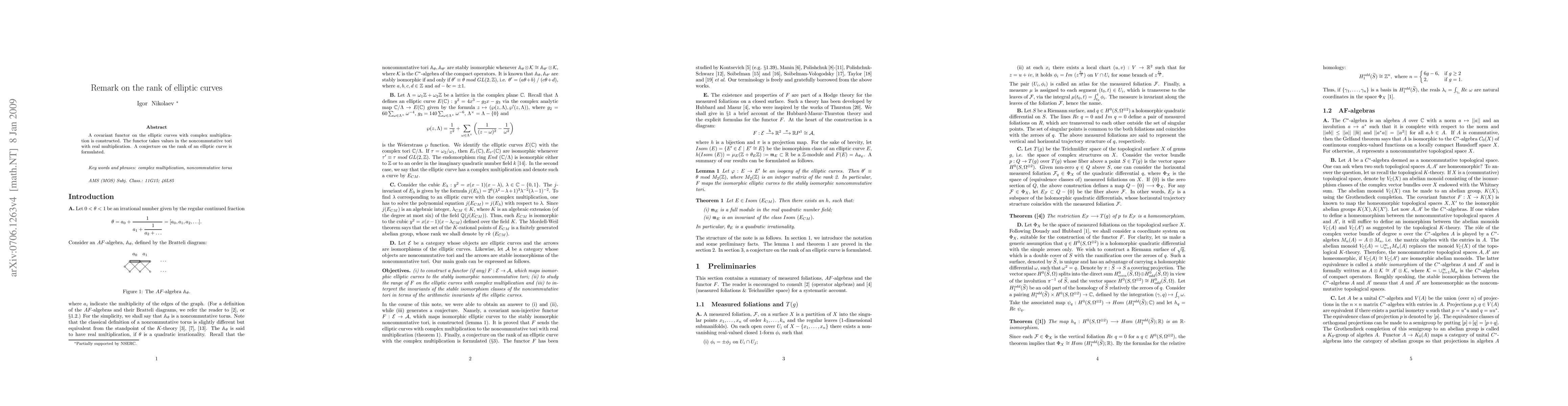 Summary: This paper constructs a covariant functor on elliptic curves with complex multiplication, mapping them to noncommutative tori with real multiplication, and proposes a conjecture regarding the rank of these elliptic curves.
