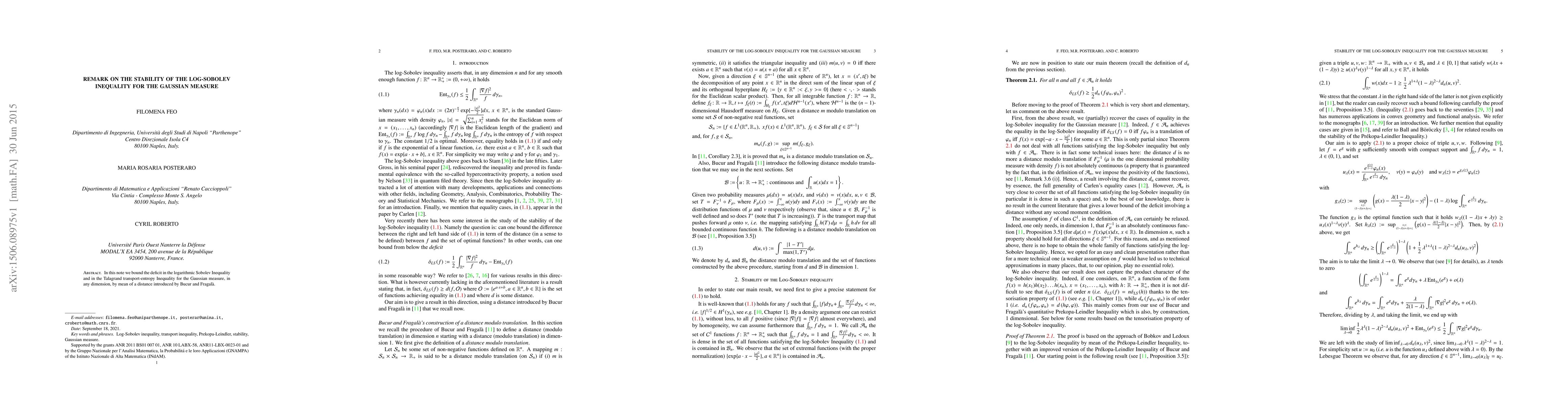 In this note we bound the deficit in the logarithmic Sobolev Inequality and in the Talagrand transport-entropy Inequality for the Gaussian measure, in any dimension, by mean of a distance introduced by Bucur and Fragal\`a.