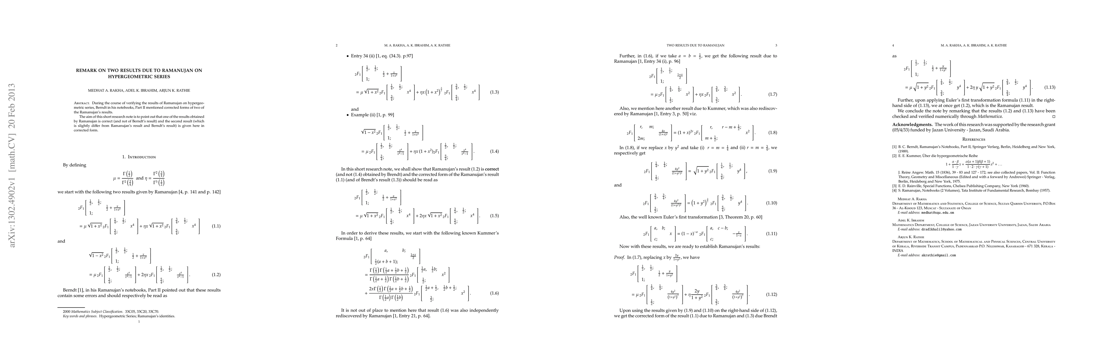 This paper verifies Ramanujan's results on hypergeometric series, showing that one of them is correct as originally stated, while the other, previously corrected by Berndt, is presented here in its corrected form.