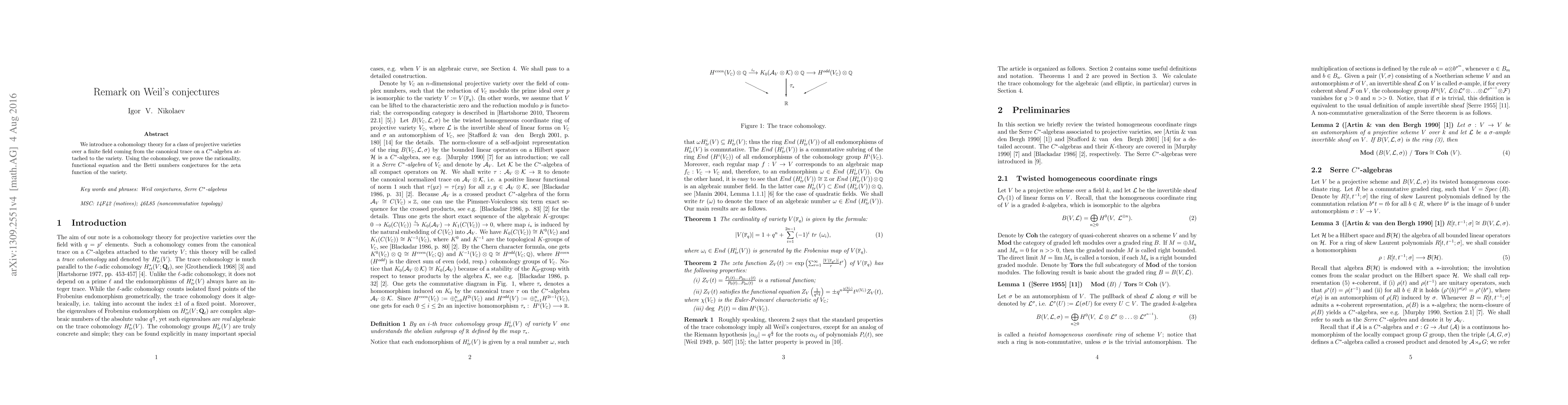 Summary: This paper develops a novel cohomology theory for projective varieties over finite fields, proving Weil's conjectures—rationality, functional equation, and Betti numbers—for the zeta function using the canonical trace on a C*-algebra associated with the variety.