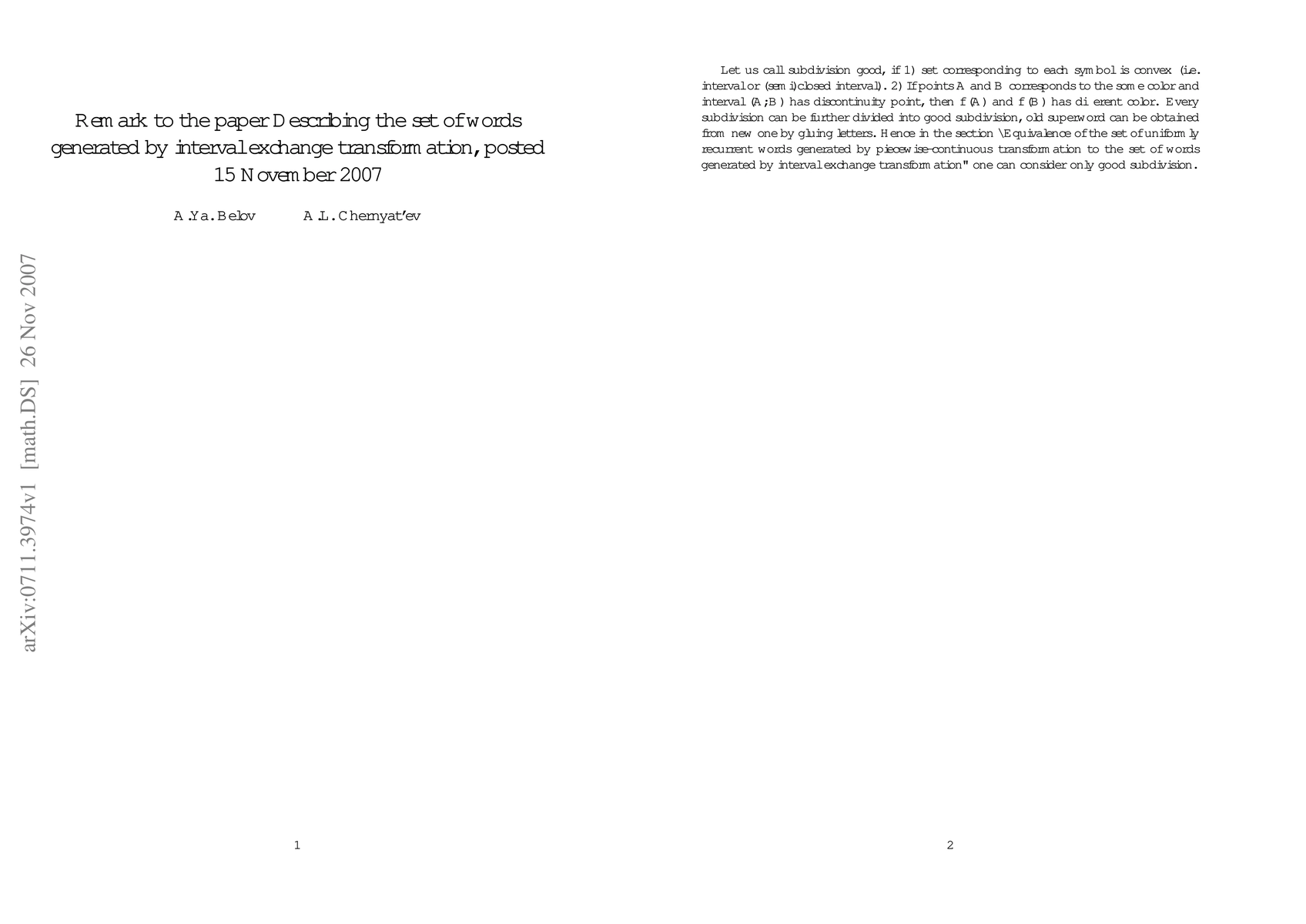Let us call subdivision {\it good}, if 1) set corresponding to each symbol is convex (i.e. interval or (semi)closed interval). 2) If points $A$ and $B$ corresponds to the some color and interval $(A,B)$ has discontinuity point, then $f(A)$ and $f(B)$ has different color. Every subdivision can be further divided into good subdivision, old superword can be obtained from new one by gluing letters. Hence in the section ``Equivalence of the set of uniformly recurrent words generated by piecewise-continuous transformation to the set of words generated by interval exchange transformation'' one can consider only good subdivision.