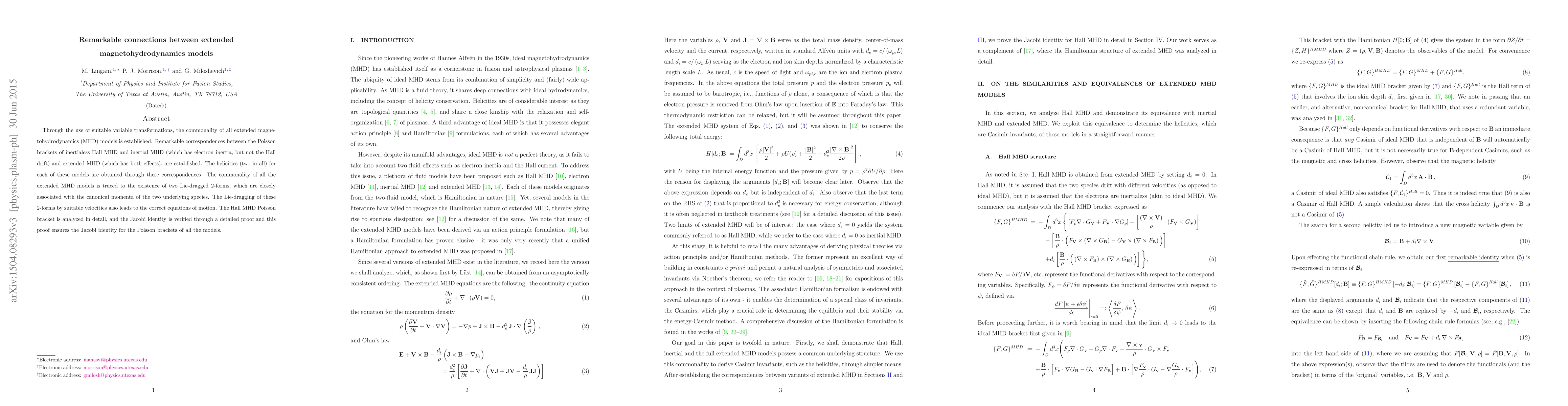 Through the use of suitable variable transformations, the commonality of all extended magnetohydrodynamics (MHD) models is established. Remarkable correspondences between the Poisson brackets of inertialess Hall MHD and inertial MHD (which has electron inertia, but not the Hall drift) and extended MHD (which has both effects), are established. The helicities (two in all) for each of these models are obtained through these correspondences. The commonality of all the extended MHD models is traced to the existence of two Lie-dragged 2-forms, which are closely associated with the canonical momenta of the two underlying species. The Lie-dragging of these 2-forms by suitable velocities also leads to the correct equations of motion. The Hall MHD Poisson bracket is analyzed in detail, and the Jacobi identity is verified through a detailed proof and this proof ensures the Jacobi identity for the Poisson brackets of all the models.