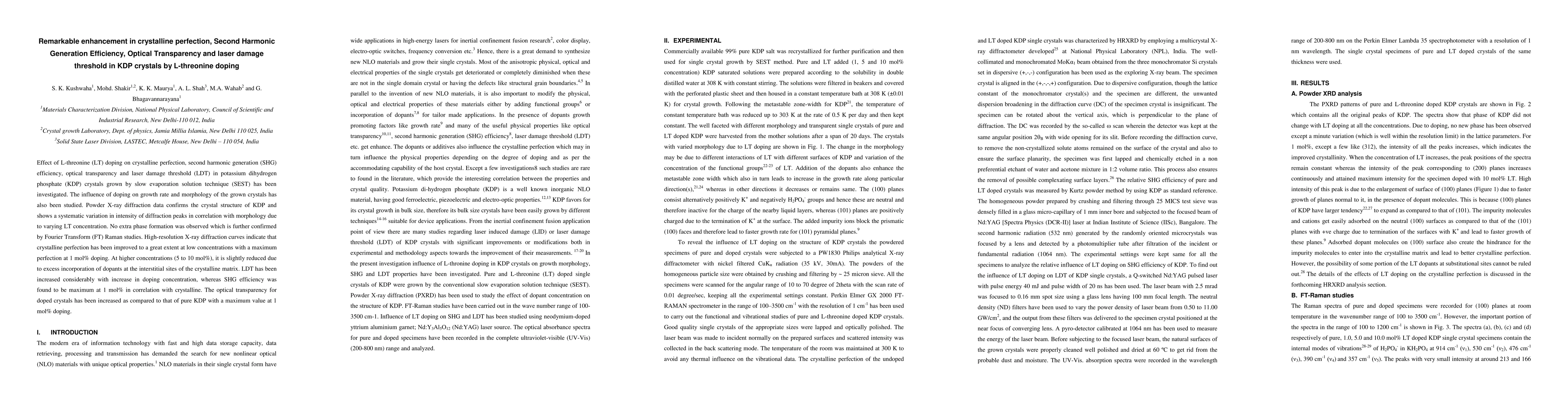 Effect of L-threonine (LT) doping on crystalline perfection, second harmonic generation (SHG) efficiency, optical transparency and laser damage threshold (LDT) in potassium dihydrogen phosphate (KDP) crystals grown by slow evaporation solution technique (SEST) has been investigated. The influence of doping on growth rate and morphology of the grown crystals has also been studied. Powder X-ray diffraction data confirms the crystal structure of KDP and shows a systematic variation in intensity of diffraction peaks in correlation with morphology due to varying LT concentration. No extra phase formation was observed which is further confirmed by Fourier Transform (FT) Raman studies. High-resolution X-ray diffraction curves indicate that crystalline perfection has been improved to a great extent at low concentrations with a maximum perfection at 1 mol% doping. At higher concentrations (5 to 10 mol%), it is slightly reduced due to excess incorporation of dopants at the interstitial sites of the crystalline matrix. LDT has been increased considerably with increase in doping concentration, whereas SHG efficiency was found to be maximum at 1 mol% in correlation with crystalline. The optical transparency for doped crystals has been increased as compared to that of pure KDP with a maximum value at 1 mol% doping.