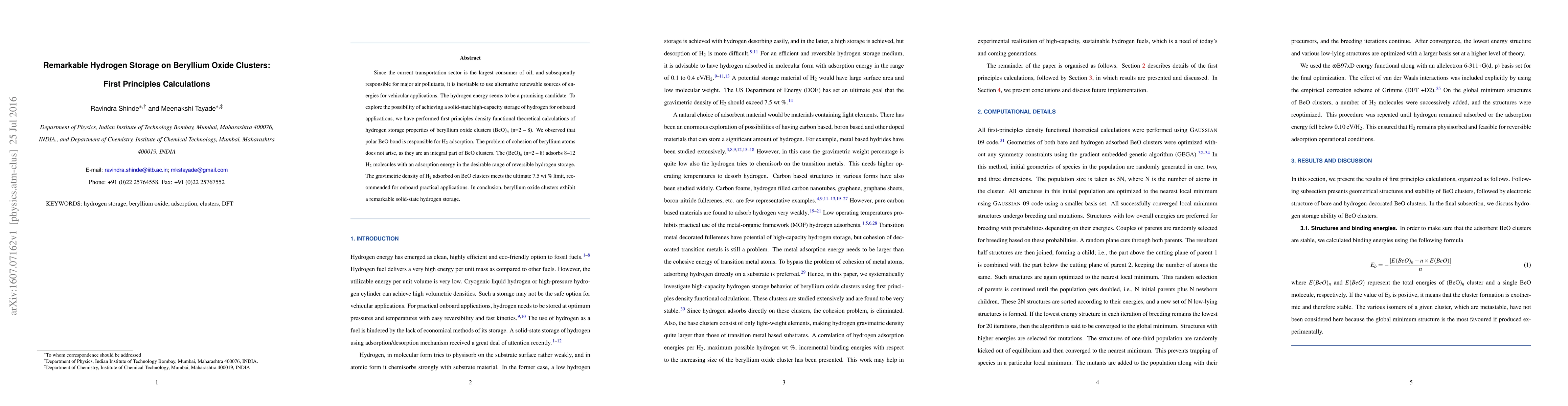 This study uses first principles calculations to demonstrate that beryllium oxide clusters (BeO)$_{n}$ (n=2 -- 8) can store hydrogen effectively, meeting the 7.5 wt% gravimetric density limit for practical onboard applications. The polar BeO bond facilitates H$_{2}$ adsorption, ensuring high-capacity reversible hydrogen storage without cohesion issues.