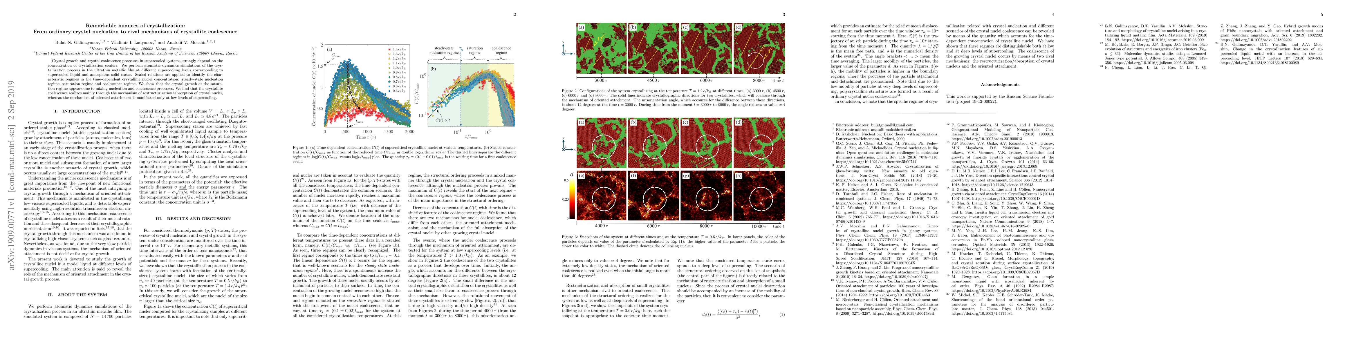 This paper investigates the crystallization processes in ultrathin metallic films, identifying distinct regimes of nucleation, saturation, and coalescence through atomistic simulations. It reveals that crystal growth in the saturation regime results from both mixing nucleation and coalescence, with coalescence primarily occurring via restructurization/absorption rather than oriented attachment, except at low supercooling levels.