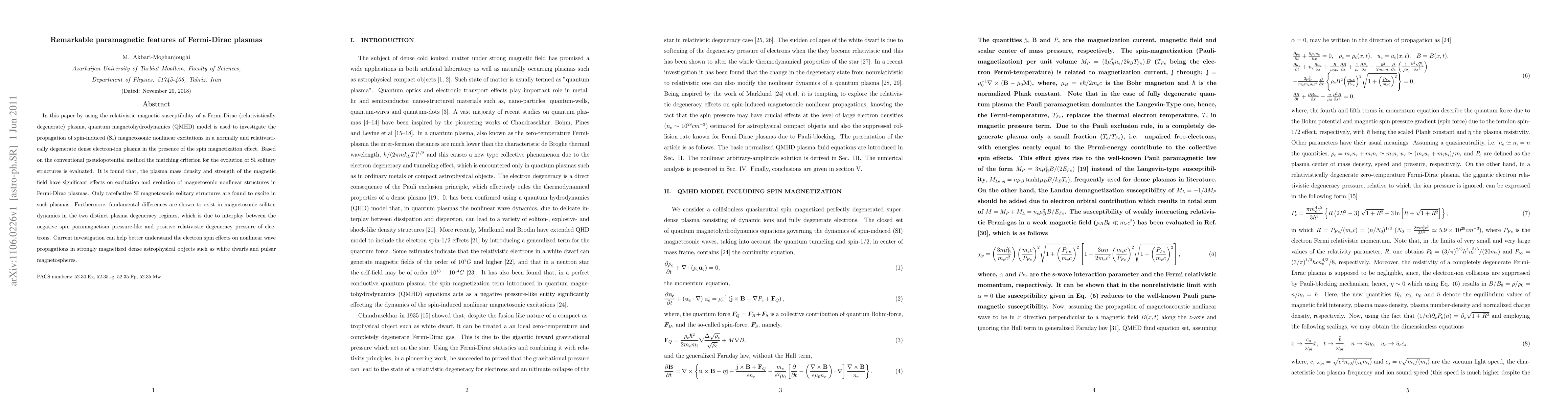 This paper investigates spin-induced magnetosonic nonlinear excitations in Fermi-Dirac plasmas using the QMHD model, revealing significant effects of plasma density and magnetic field strength on these excitations. It highlights fundamental differences in soliton dynamics between normal and relativistic degeneracy regimes due to spin paramagnetism and relativistic electron degeneracy pressure.