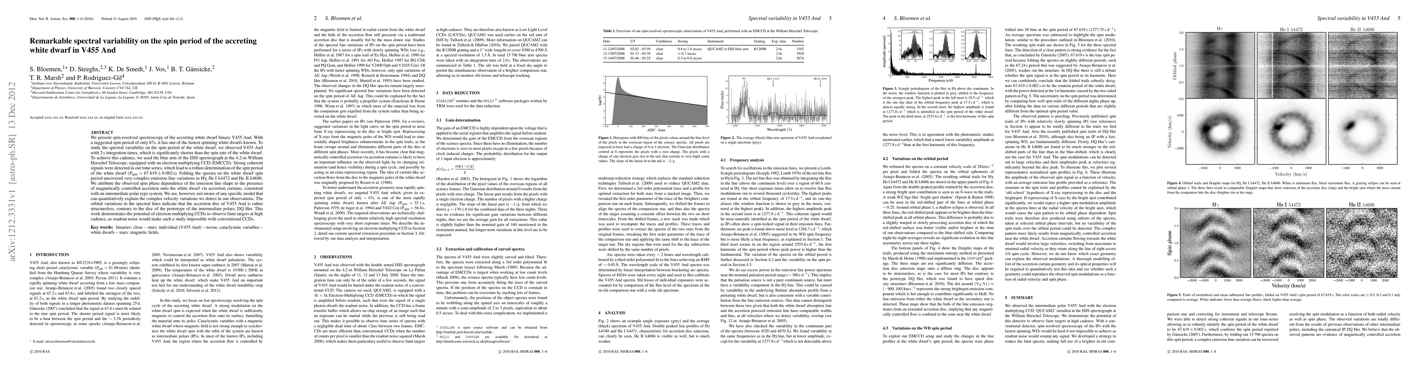 This study reveals remarkable spectral variability in the spin period of the rapidly spinning accreting white dwarf in V455 And, detected through high-cadence spectroscopy using an electron multiplying CCD. The observed spin period is 67.619 ± 0.002 s, and the spectral lines show complex variations attributed to magnetically controlled accretion, indicating a structureless accretion disc.