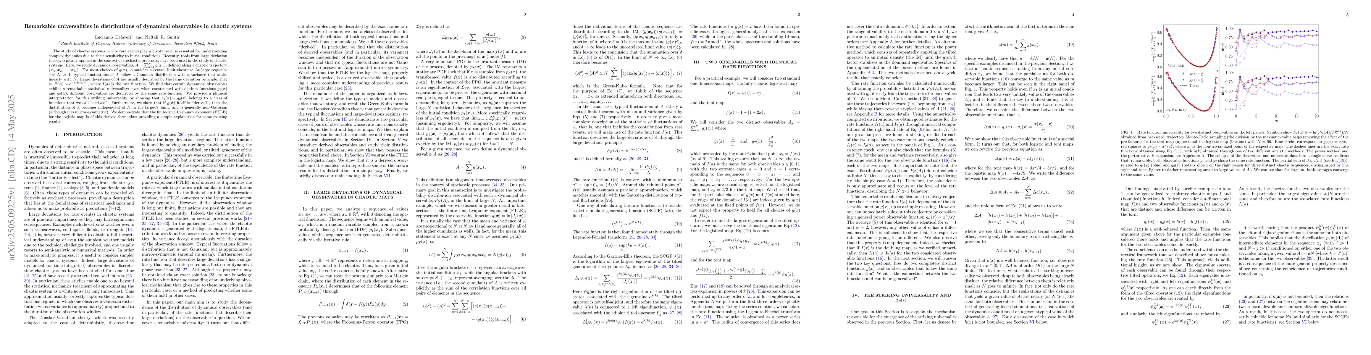 The research investigates dynamical observables in chaotic systems, applying large deviation theory to study fluctuations of observables A defined along chaotic trajectories. Distinct functions g1(x) and g2(x) are found to share the same rate function, indicating statistical universality.