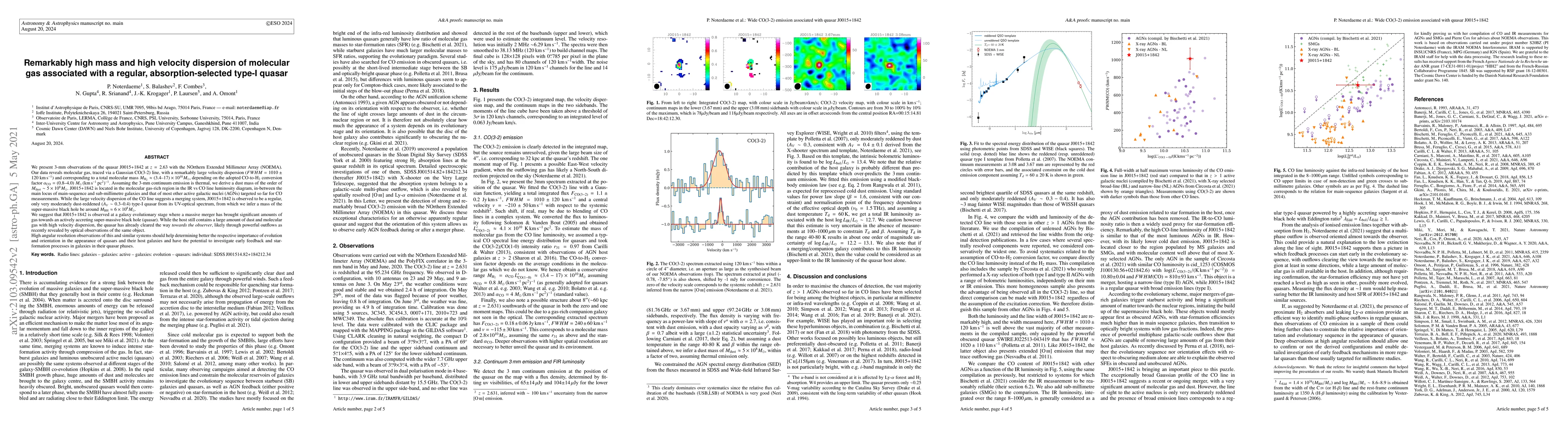 We present 3-mm observations of the quasar J0015+1842 at z=2.63 with the NOrthern Extended Millimeter Array (NOEMA). Our data reveals molecular gas, traced via a Gaussian CO(3-2) line, with a remarkably large velocity dispersion (FWHM=1010+/-120 km/s) and corresponding to a total molecular mass MH2~(3.4-17)x10^10 Msun, depending on the adopted CO-to-H2 conversion factor alphaCO=(0.8-4.0) Msun (km/s pc^2)^-1. Assuming the 3-mm continuum emission is thermal, we derive a dust mass of the order of Mdust ~5x10^8 Msun. J0015+1842 is located in the molecular gas-rich region in the IR vs CO line luminosity diagram, in-between the main locus of main-sequence and sub-millimetre galaxies and that of most other AGNs targeted so far for CO measurements. While the large velocity dispersion of the CO line suggests a merging system, J0015+1842 is observed to be a regular, only very moderately dust-reddened (Av~0.3-0.4) type-I quasar from its UV-optical spectrum, from which we infer a mass of the super-massive black hole be around MBH~6x10^8 Msun. We suggest that J0015+1842 is observed at a galaxy evolutionary stage where a massive merger has brought significant amounts of gas towards an actively accreting super-massive black hole (quasar). While the host still contains a large amount of dust and molecular gas with high velocity dispersion, the quasar has already cleared the way towards the observer, likely through powerful outflows as recently revealed by optical observations of the same object. High angular resolution observations of this and similar systems} should help determining better the respective importance of evolution and orientation in the appearance of quasars and their host galaxies and have the potential to investigate early feedback and star-formation processes in galaxies in their quasar phases.