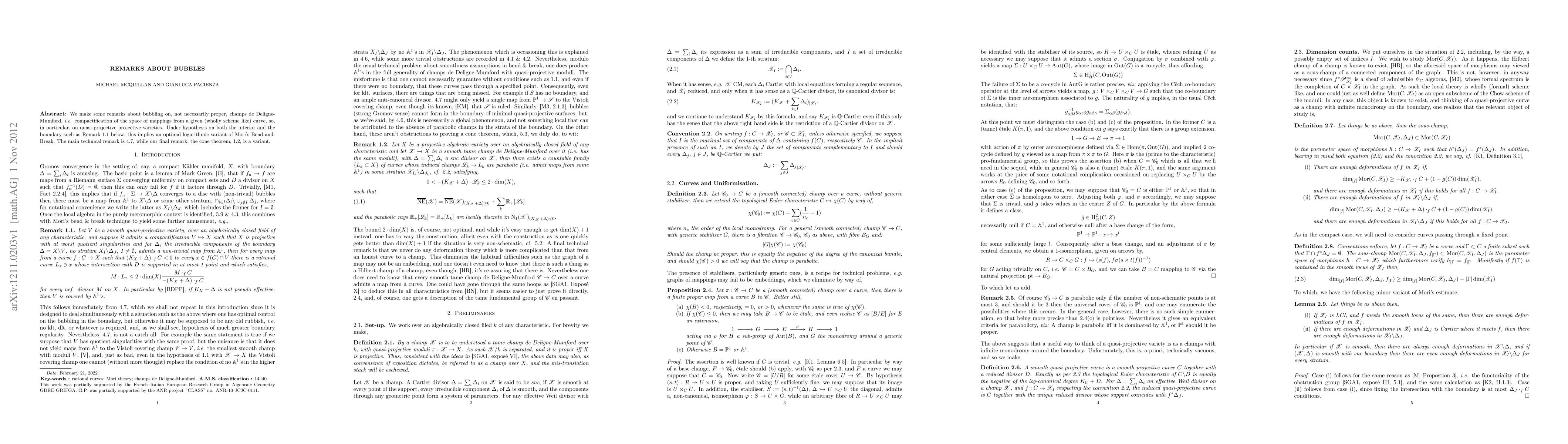 We make some remarks about bubbling on, not necessarily proper, champs de Deligne-Mumford, i.e. compactification of the space of mappings from a given (wholly scheme like) curve, so, in particular, on quasi-projective projective varieties. Under hypothesis on both the interior and the boundary such as Remark \ref{rmk:interior} below, this implies an optimal logarithmic variant of Mori's Bend-and-Break. The main technical remark is \ref{thm:logMM}, while our final remark, the cone theorem, \ref{rmk:cone}, is a variant.