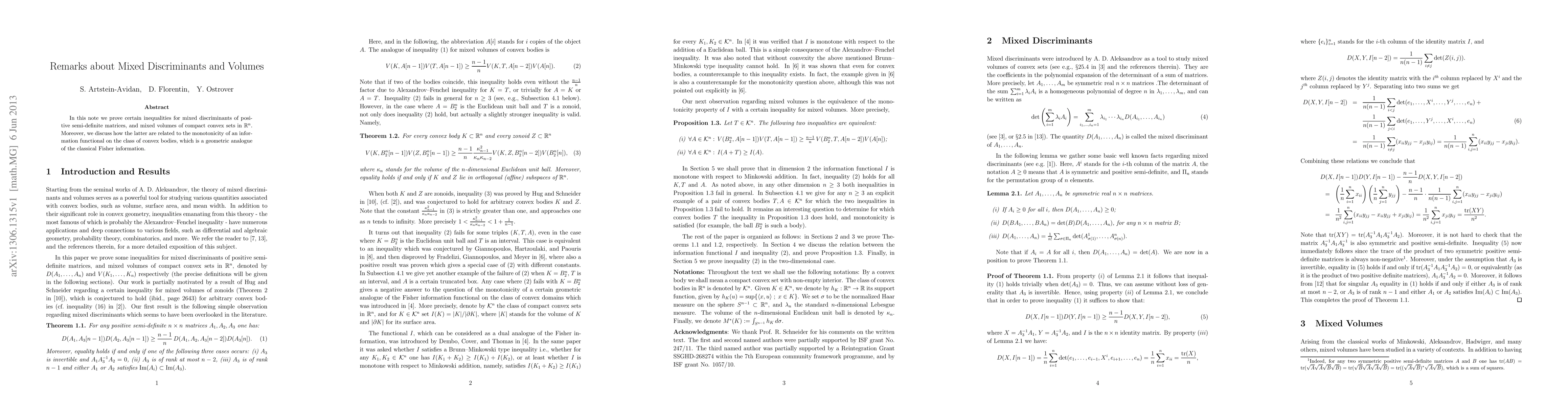 This paper proves inequalities for mixed discriminants of positive semi-definite matrices and mixed volumes of compact convex sets in n-dimensions. It also explores the connection between mixed volumes and the monotonicity of an information functional, analogous to the classical Fisher information.