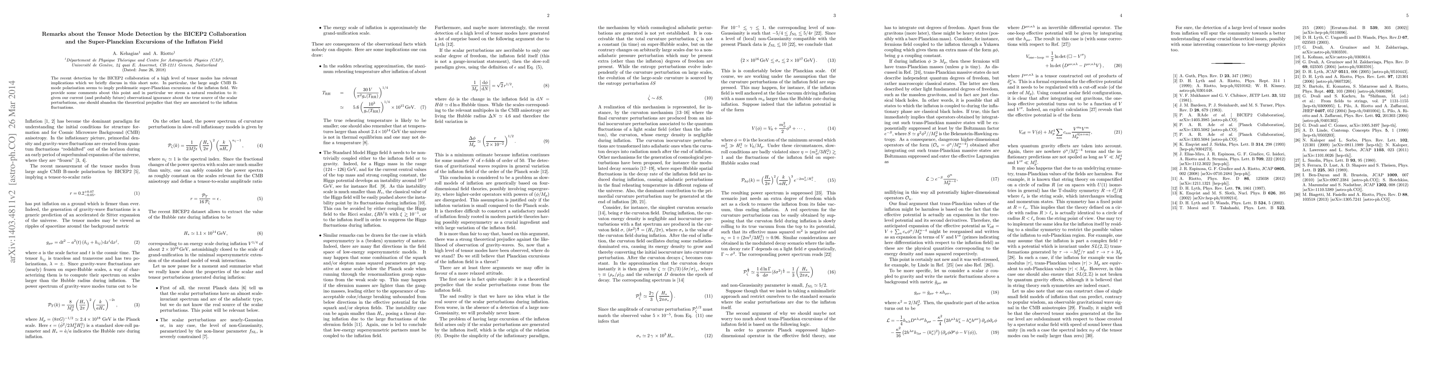 The recent detection by the BICEP2 collaboration of a high level of tensor modes has relevant implications which we briefly discuss in this short note. In particular, the large angle CMB B- mode polarisation seems to imply problematic super-Planckian excursions of the inflaton field. We provide some comments about this point and in particular we stress a natural resolution to it: given our current (and probably future) observational ignorance about the true source of the scalar perturbations, one should abandon the theoretical prejudice that they are associated to the inflaton fluctuations.