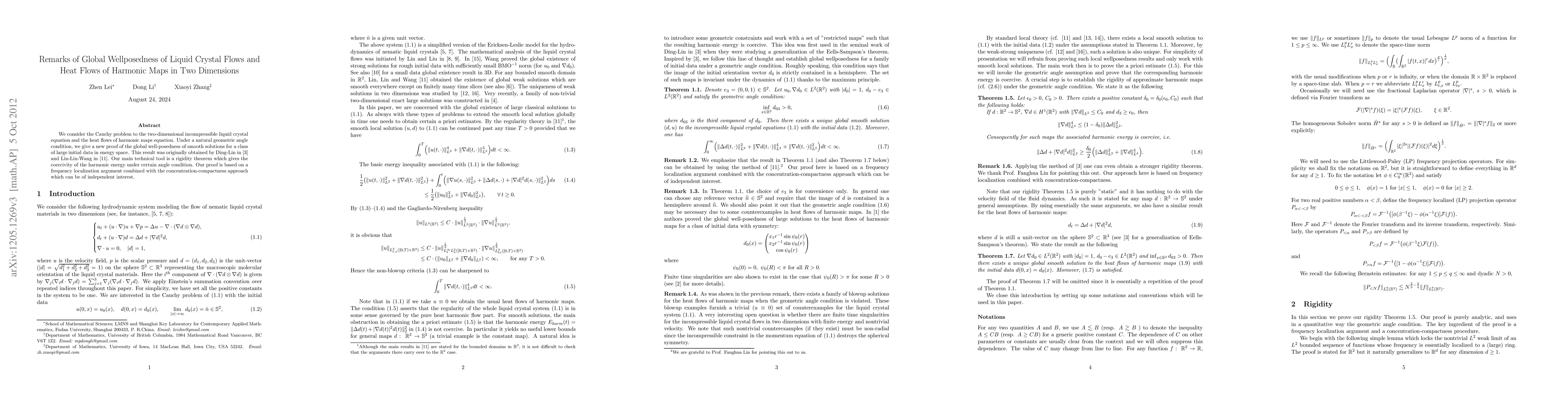 We consider the Cauchy problem to the two-dimensional incompressible liquid crystal equation and the heat flows of harmonic maps equation. Under a natural geometric angle condition, we give a new proof of the global well-posedness of smooth solutions for a class of large initial data in energy space. This result was originally obtained by Ding-Lin in \cite{DingLin} and Lin-Lin-Wang in \cite{LinLinWang}. Our main technical tool is a rigidity theorem which gives the coercivity of the harmonic energy under certain angle condition. Our proof is based on a frequency localization argument combined with the concentration-compactness approach which can be of independent interest.